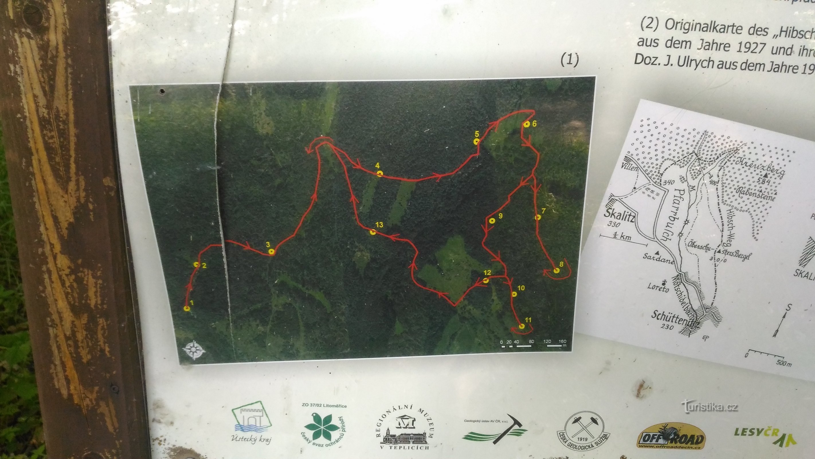 Hibschova naučná stezka vznikla v roce 1927. Byla zaměřena na geologické zajímavosti ve svazích Dlouhého vrchu a Křížové hory. Stezka byla pojmenována po geologovi Emanuelu Hibschovi, který se zasloužil o geologické poznání Českého středohoří. Stezka vede ke křemencovým skalním blokům, které byly pojmenovány po významných přírodovědcích. Stezka po roce 1945 byla zapomenuta a zanikla. V roce 2007…