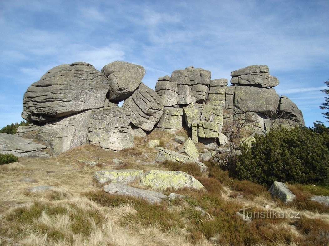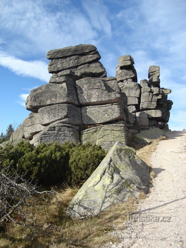 Červeně značená hraniční hřebenová Cesta česko-polského přátelství (Glówny Szlak Sudecki) prochází mezi skalními útvary tak, že dva ponechává na…