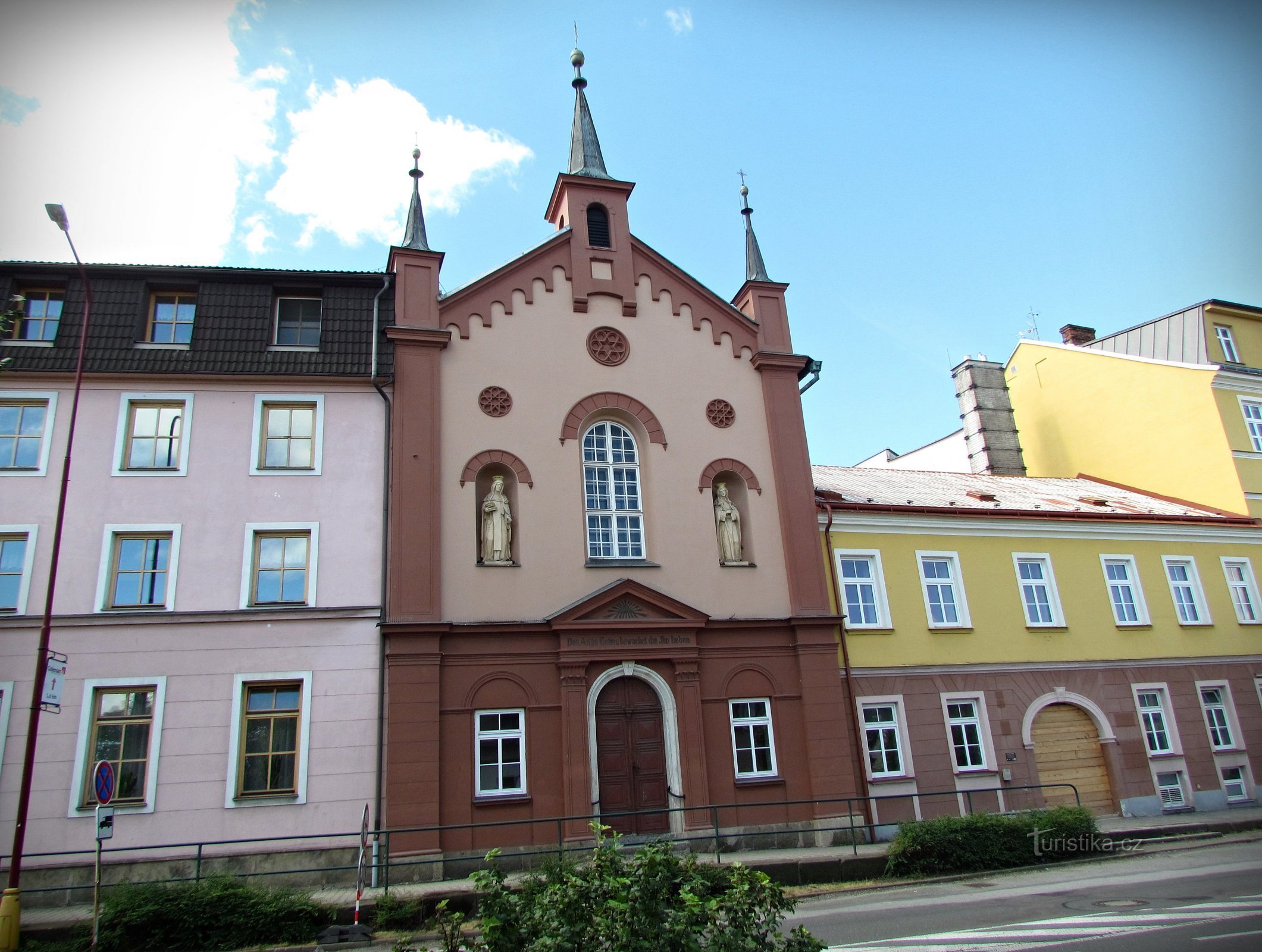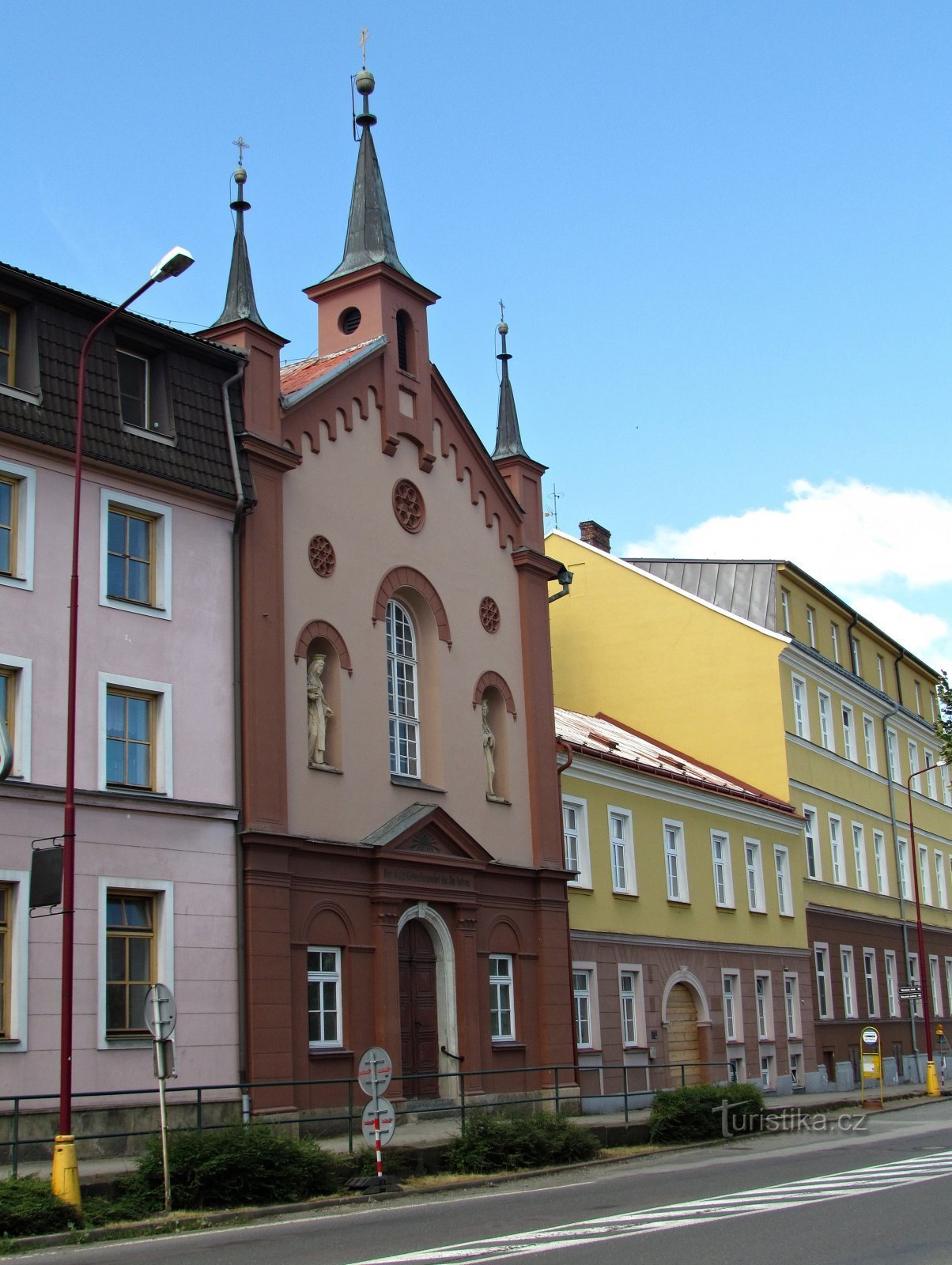 Západně od historického centra města se na ulici T.G.Masaryka můžeme potěšit pohledem na vysoký a členitý barevný štít novorománské kaple, který je z obou stran sevřen okolními budovami. Kaple sv.Vincence tady byla vystavěna roku 1867 a stala se součástí Domova na rozcestí – ústavu sociální péče.