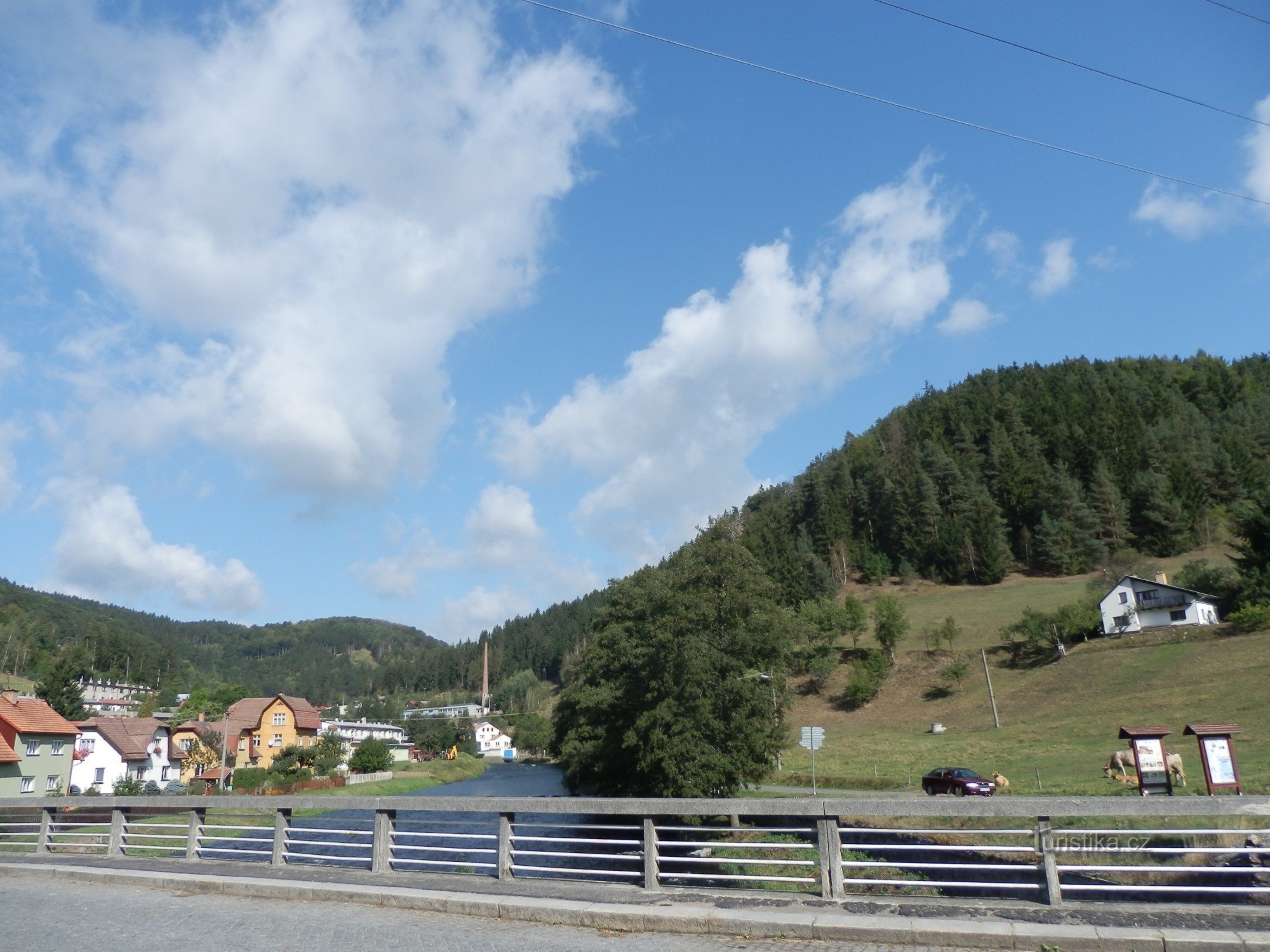 Od rozcestí a autobusové zastávky u mostu se dáme po modré turistické značce ve směru na Svojanov, který ale dnes naším cílem nebude (už jsme ho letos navštívili).