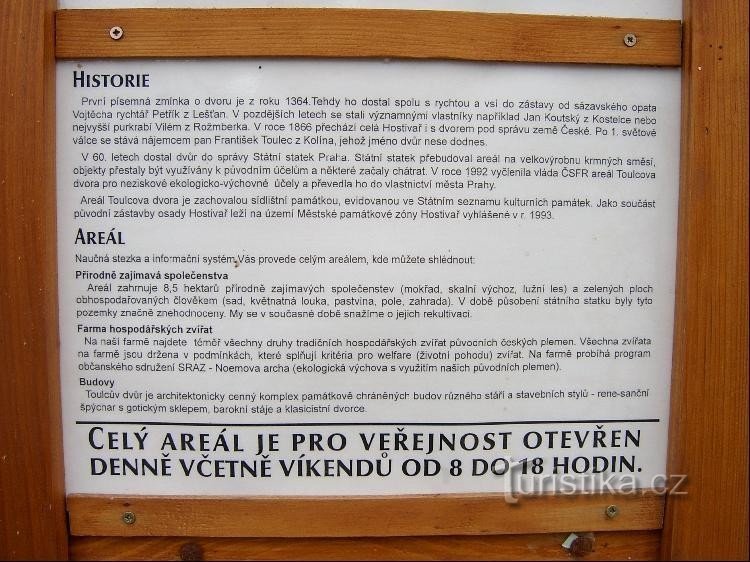 Na 8 hektarech plochy se nachází komplex památkově chráněných budov (gotický špýchar, barokní stáje), přírodně zajímavá společenstva (mokřad, lužní les, skalní výchoz, javorový les, květnatá louka.) a zelené plochy obhospodařované člověkem (sad, pole, ekozahrada, školka lesních dřevin.). Součástí areálu je hospodářský dvůr s huculskými koňmi, ovcemi, kozami a dalšími domácími zvířaty. Areál je…