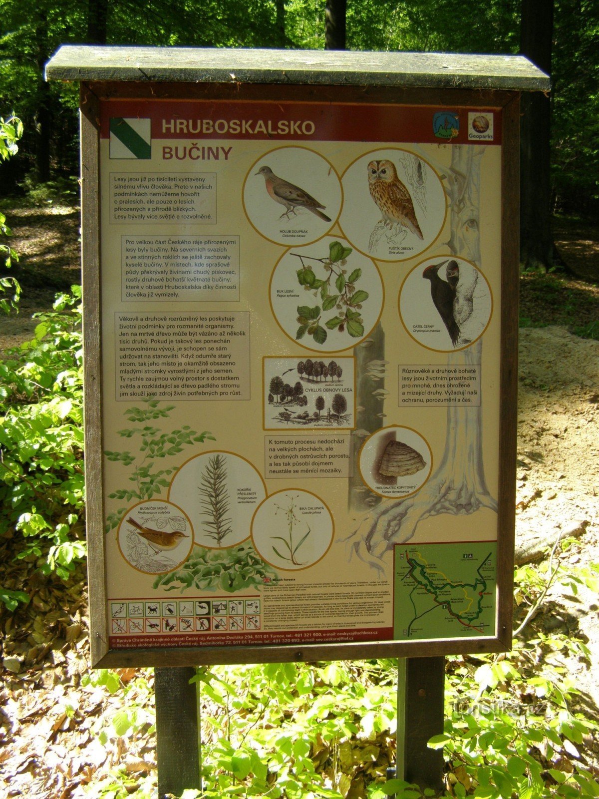 Naučná stezka Hruboskalsko je vedena v oblasti mezi zámkem Hrubá Skála, Lázněmi Sedmihorky a Valdštejnem. NS kopíruje 3 základní značení turistických tras, po modré značce ze Sedmihorek k rozcestí u Kavčin, kde se NS napojuje na červeně značenou Zlatou stezku Českého ráje, která nás spolehlivě, kolem krásných vyhlídek na skalní města, dovede k Arboretu Bukovina a k Adamovu loži. Zde Zlatou stezku…