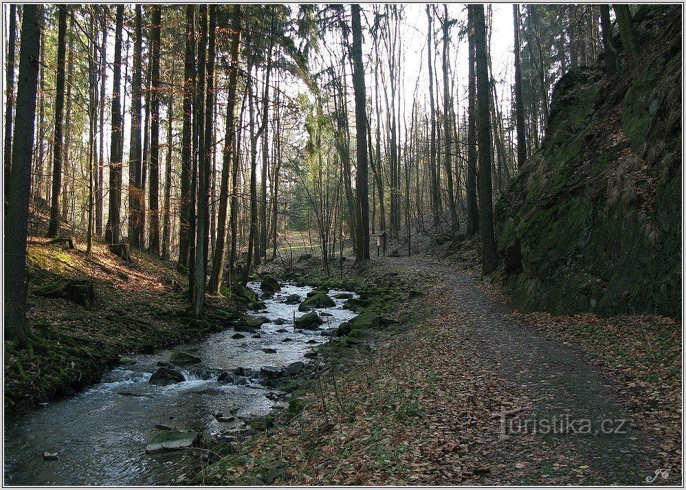 Z Temošnice (foto 1) vyrazíme po modré a zelené značce ke Zlatému potoku (foto 2) k rozcestí Třemošnice, východ. Po červené a zelené značce projdeme Hedvíkov, kolem staré továrny podél Zlatého potoka se dostaneme do Hedvičiny rokle (foto 3). Ta později přechází v Pekelskou rokli. Na jejím začátku odbočíme s červenou značkou doleva do kopce podél prudkého potůčku (foto 4). Cesta nás vyvede na…