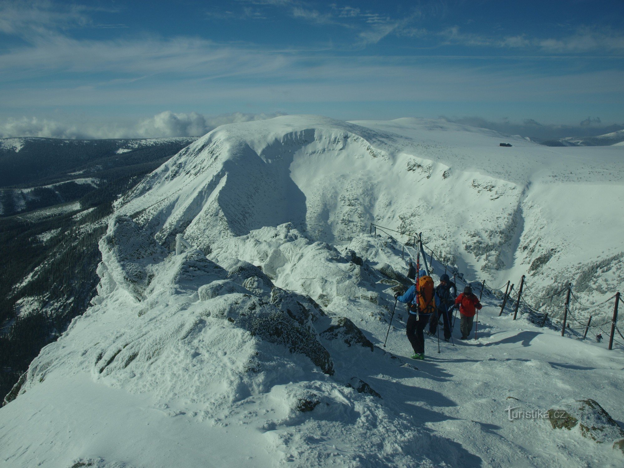 Sněžka před námi, Sněžka za námi, Sněžka vedle nás. Prostě tato hora nás při našem třídenním přechodu hřebene Krkonoš neustále doprovází a jako manekýna se natřásá s mlhavou sukýnkou kolem pasu. Užívá si, že je středem zájmů všech fotoaparátů. Neméně fotogenické „křoví“ této jiskrně mrazivé kráse dělají nekonečné sněhobílé pláně.