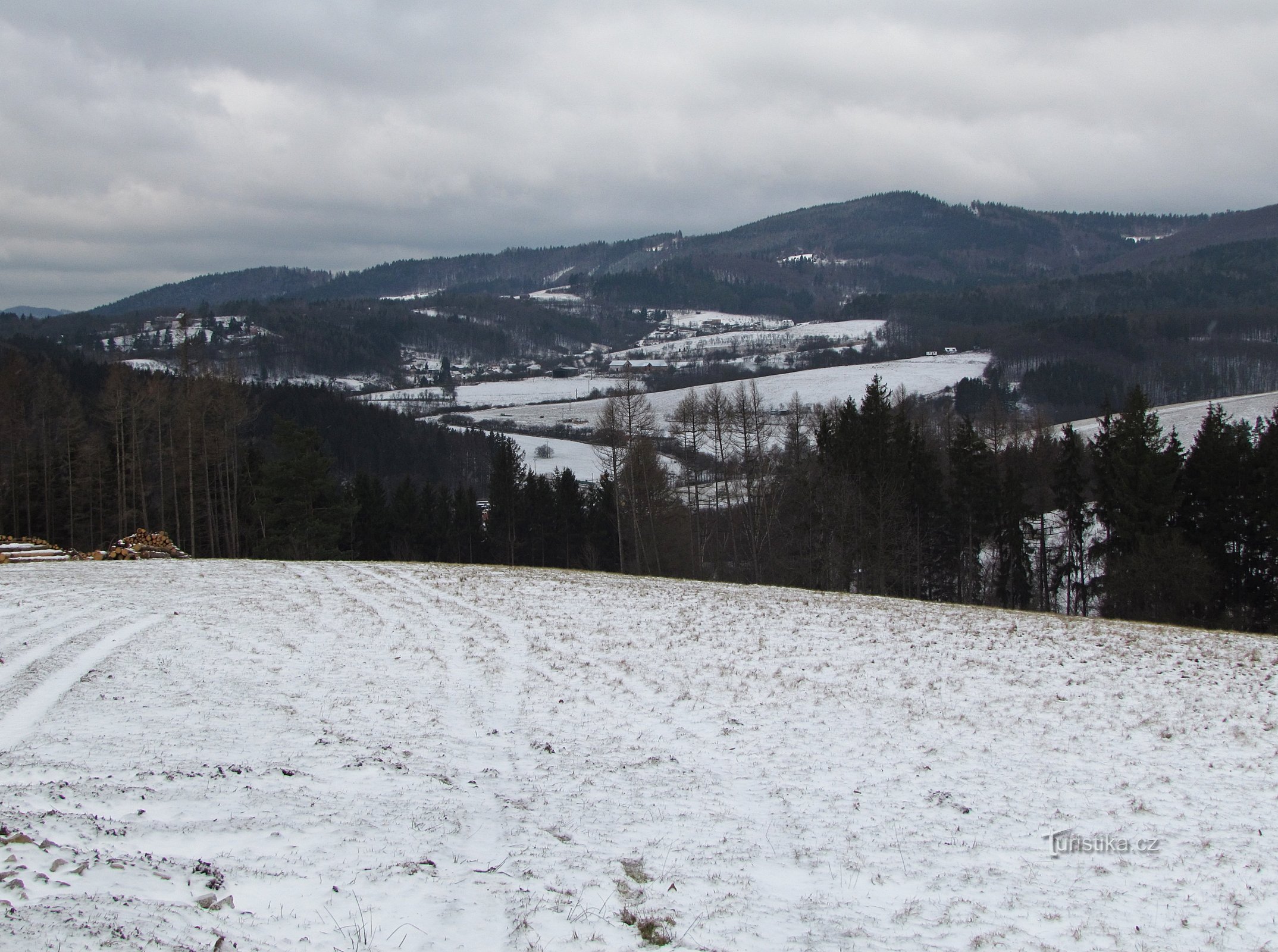 Na zelené turistické trase, sbíhající od rozcestí Papradná do podhorské obce Trnavy, jsem narazil hned na dva zajímavé výhledy. Oba se otvíraly z velké louky nacházející se asi půl kilometru východně od obce, přičemž mne z toho prvního výhledového místa zaujalo panoráma hřebene Hostýnských vrchů s několika jeho význačnými vrcholky.