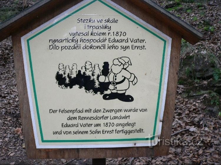 Trpasličí jeskyně leží u silnice u Rynartic nedaleko Jetřichovic. Do skály jsou vytesané reliéfy Sněhurky a trpaslíků. Od silnice sem vedou schody.