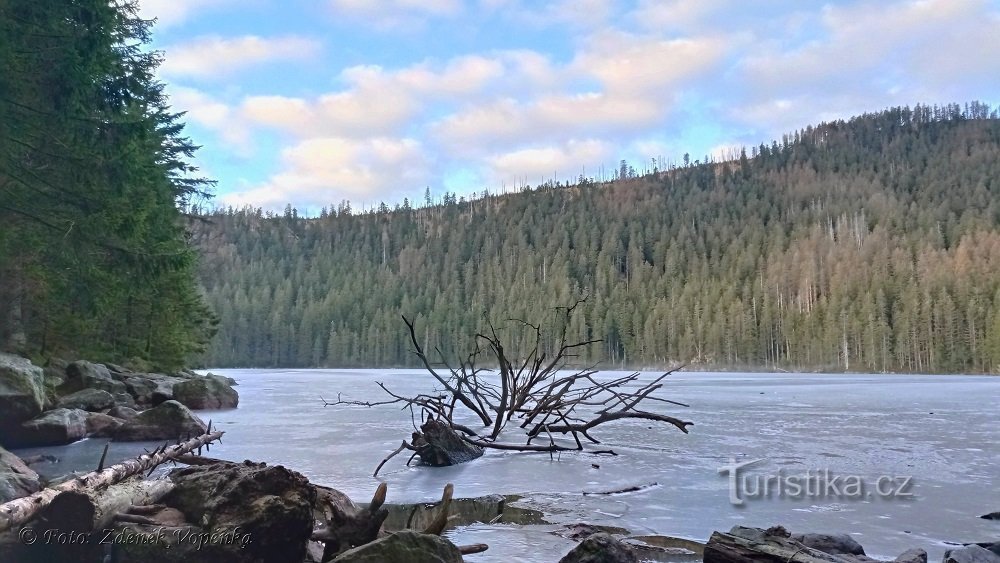Šumava nabízí bezpočet krásných pěších túr. Jedna z nich je okolo Železné Rudy. Auto nechávám na parkovišti pod Špičákem. Scházím k viaduktu a po žluté turistické stoupám podél sjezdovky proti proudu Jezerního potoka k Čertovu jezeru. Hladina je zamrzlá, ale po sněhu týden před Vánoci ani památka. Pokračuji na Rozvodí a po červené sestupuji k Černému jezeru. Jeho hladina je naopak bez ledu a…