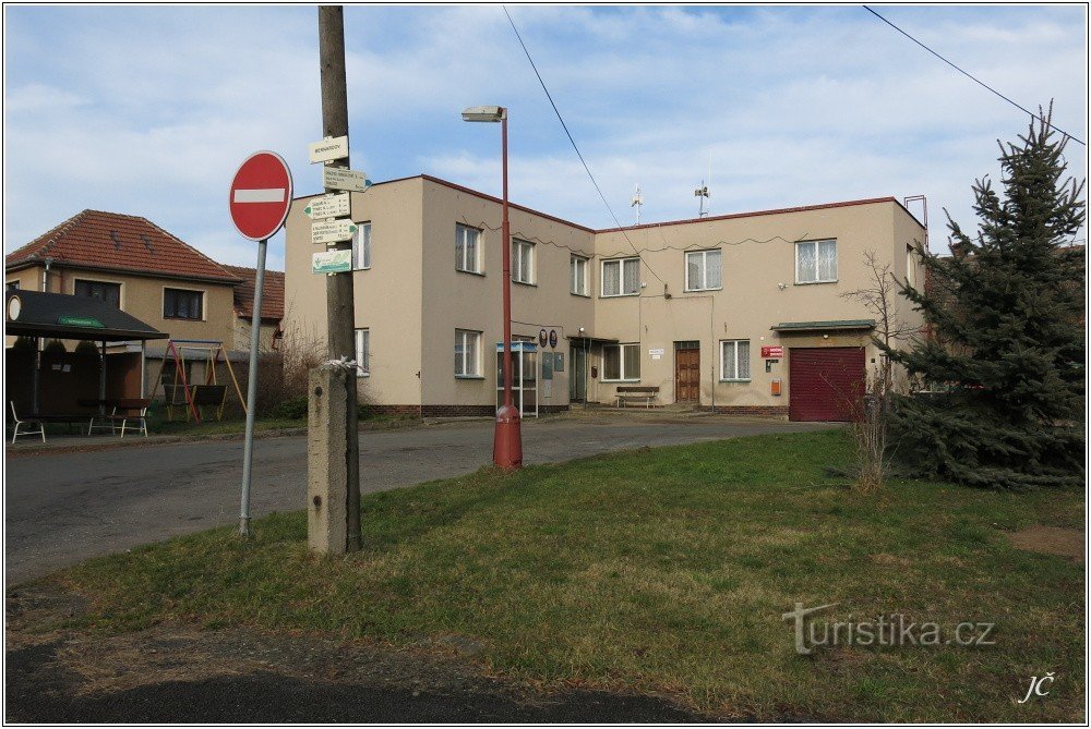 Turistické rozcestí leží na návsi obce u autobusové zastávky. Vyznačuje směry těchto značených tras: