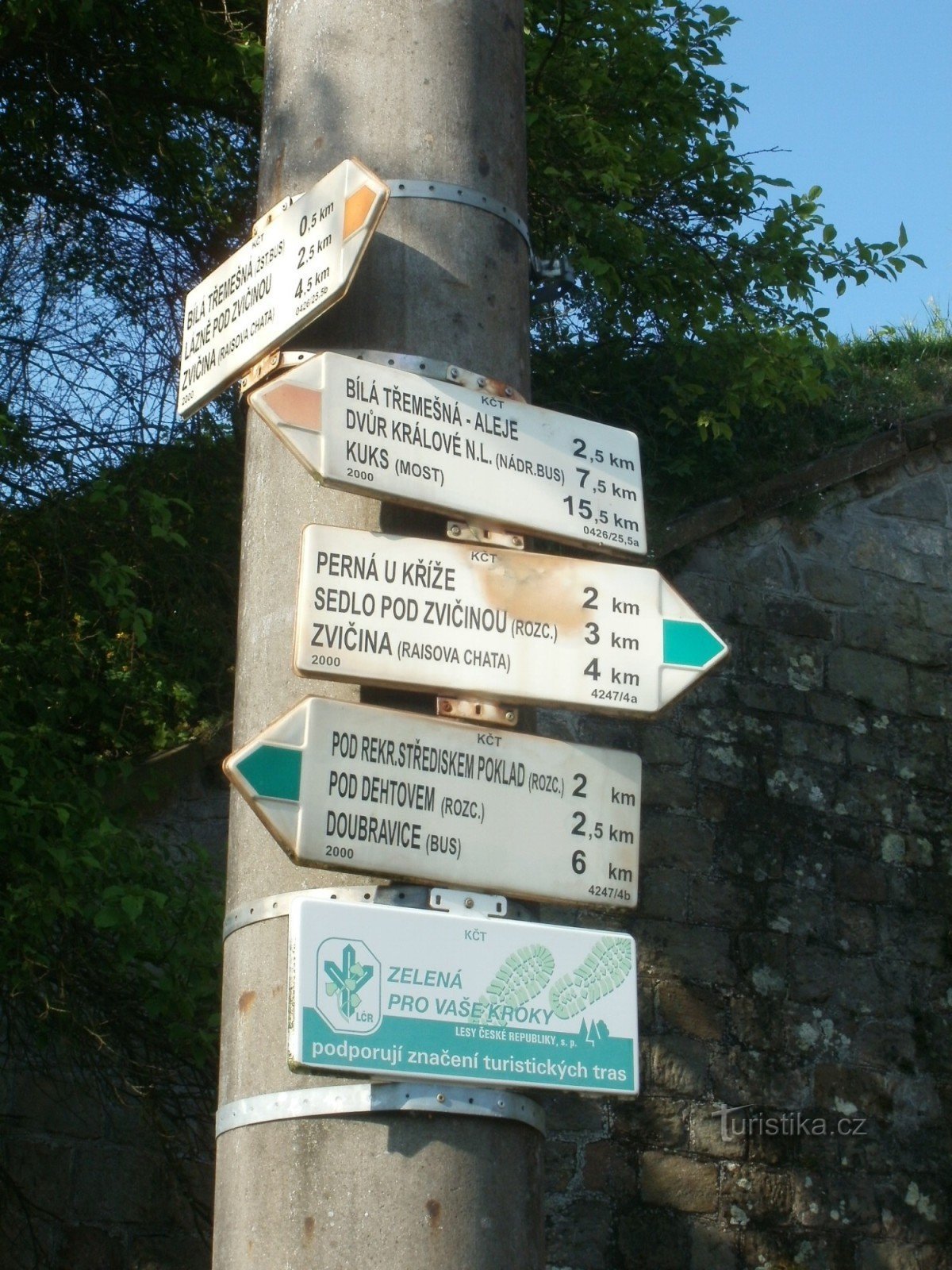 Turistický rozcestník, který se nachází u železničního mostu v Bílé Třemešné ukazuje turistům cestu do dvou směrů. Po značce červené ve směru Zvičina, Lázně Pod Zvičinou - Dvůr Králové a po značce zelené ve směru Zvičina - Doubravice, Dvůr Králové