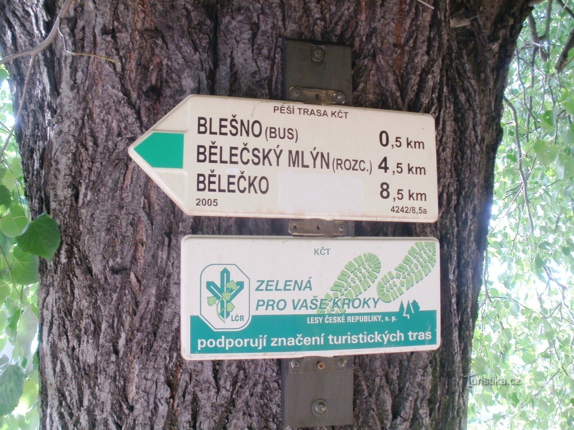 Turistický rozcestník, který se nachází u železniční zastávky v Blešně, ukazuje turistům cestu po zelené značce ve směru Blešno žst - Bělečko.
