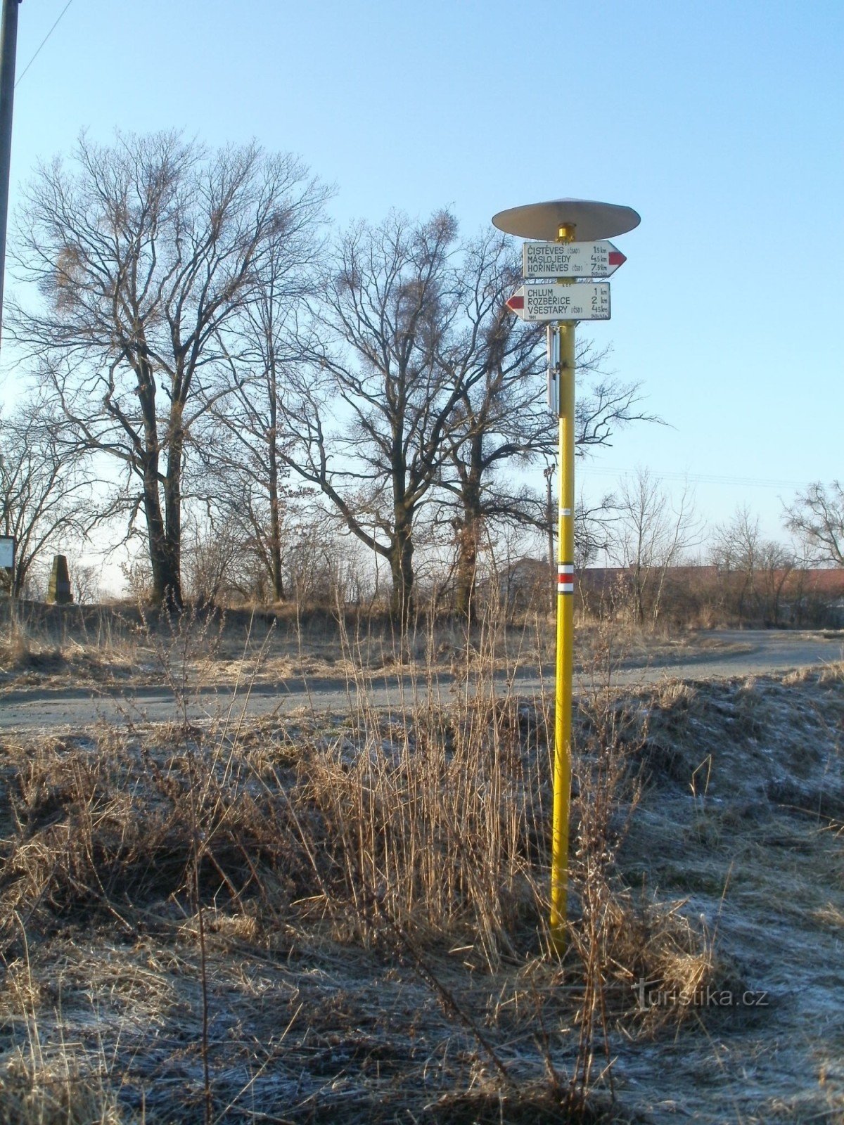 Turistický rozcestník, který se nachází v severní části areálu bojiště na Chlumu u mauzolea, ukazuje turistům cestu po červené značce ve směru Všestary, bojiště na Chlumu - Máslojedy, Hořiněves. Značena je i odbočka k mauzoleu.