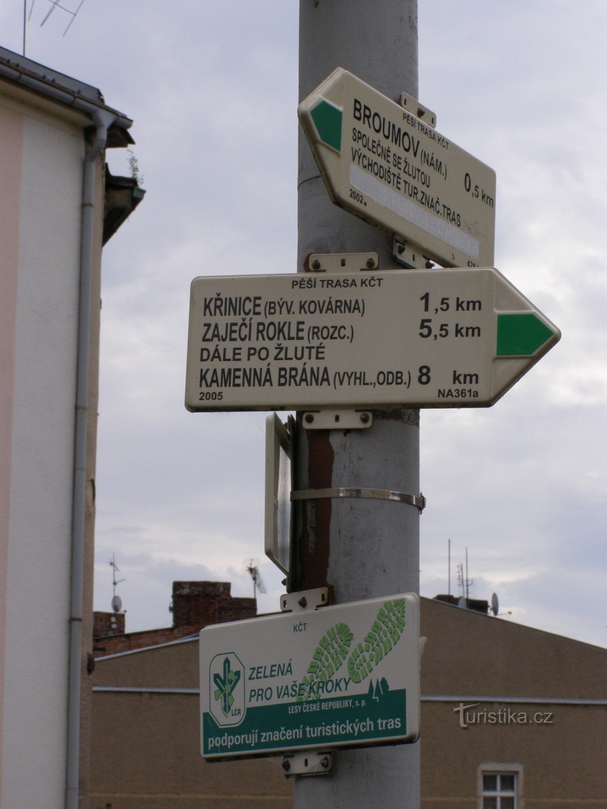 Turistický rozcestník, resp. směrník, který se nachází pod broumovským náměstím ukazuje turistům cestu po žluté trase mezi železničním nádražím a hlavním rozcestníkem, dále po značce zelené ve směru Broumov - Křinice, Zaječí rokle (Broumovské stěny).