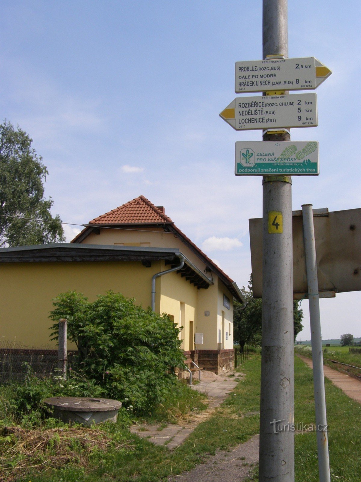 Turistický rozcestník, který se nachází u železniční zastávky Dlouhé Dvory, ukazuje turistům cestu po žluté značce ve směru Probluz, Střezetice - Rozběřice (odb. na Chlum), Neděliště, Lochenice.