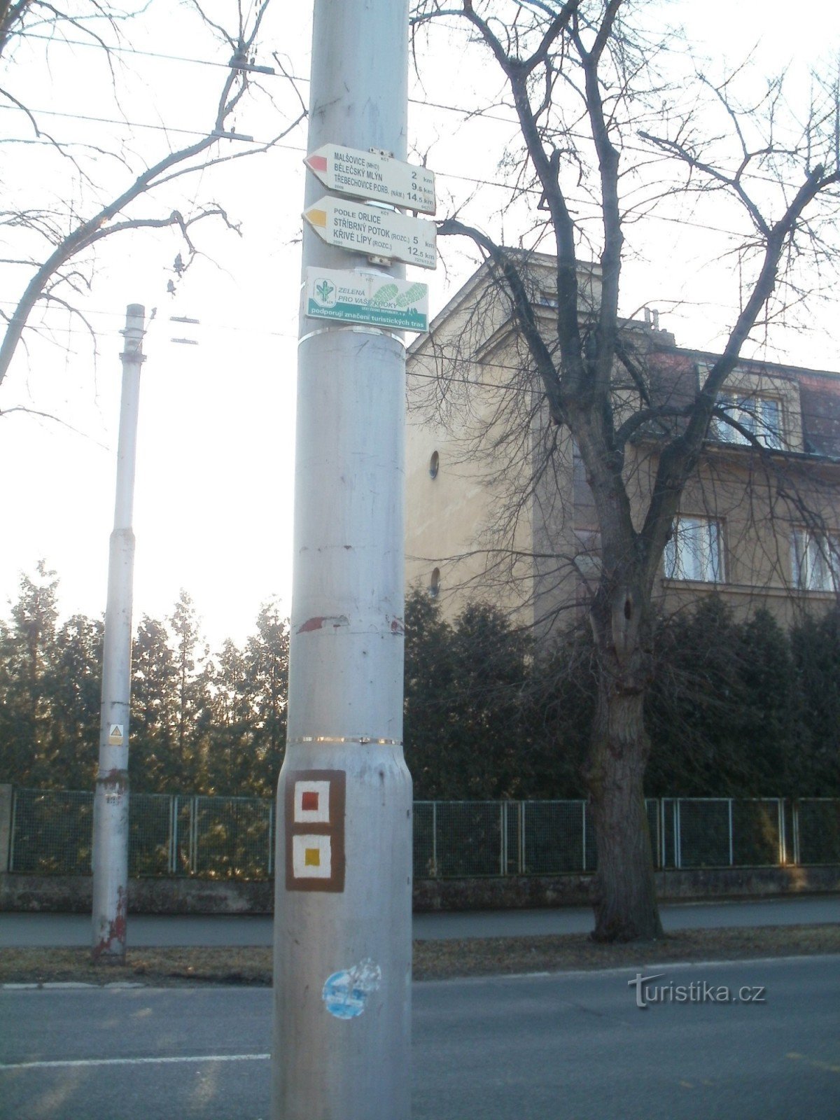 Turistický rozcestník, který se nachází u staré nemocnice nedaleko Orlice, ukazuje turistům cestu ve dvou směrech. Po červené značce ve směru HK, stará nemocnice - Třebechovice pod Orebem, Opočno a po značce žluté ve směru HK, stará nemocnice - rozcestí U křívé lípy.