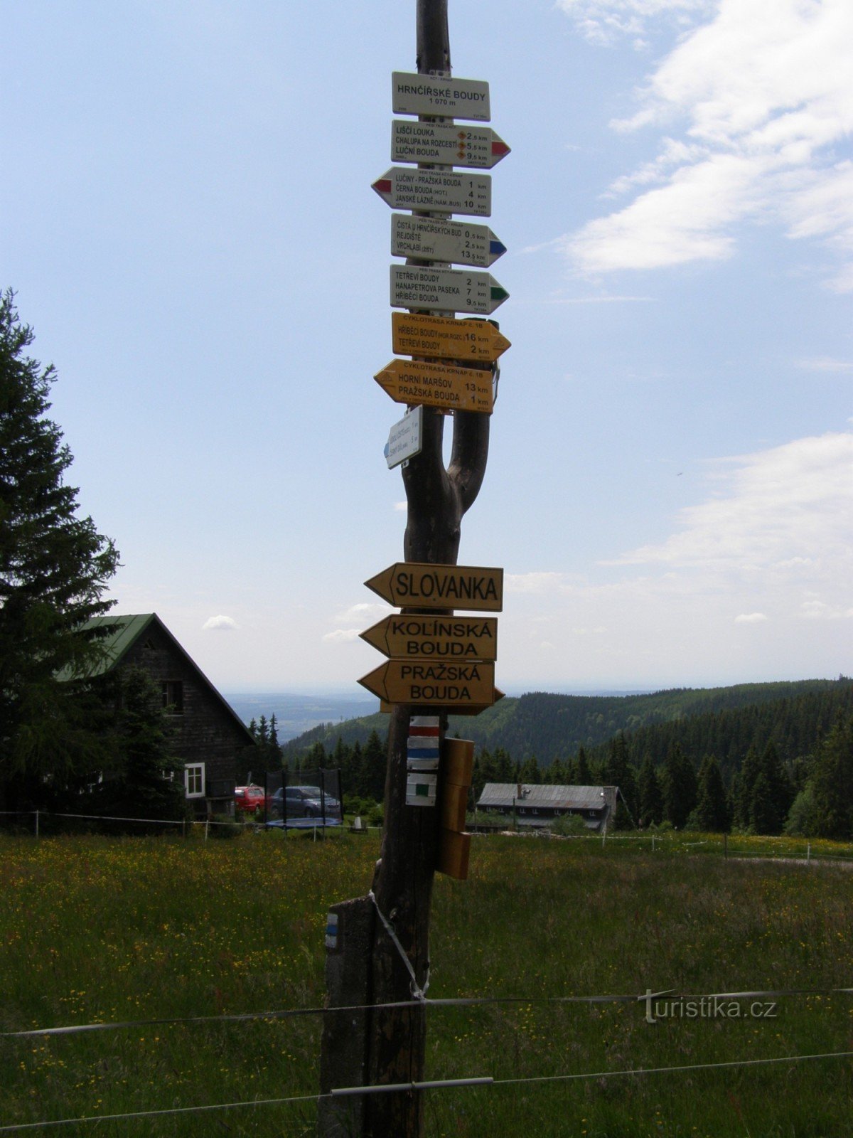 Turistický rozcestník, který se nachází v oblasti zvané Hrnčířské Boudy u Boudy Mír, ukazuje turistům cestu do tří směrů. Po značce červené ve směru Chalupa na Rozcestí, Liščí louka, Lesní bouda, rozc. Pod Lesní boudou - Lučiny, Pražská a Kolínská bouda, Černá Hora, Svoboda nad Úpou, po značce zelené ve směru Hříběcí Boudy, Tetřeví Boudy, Čistá u Hrnčířských bud - Bouda Mír a po značce modré ve…