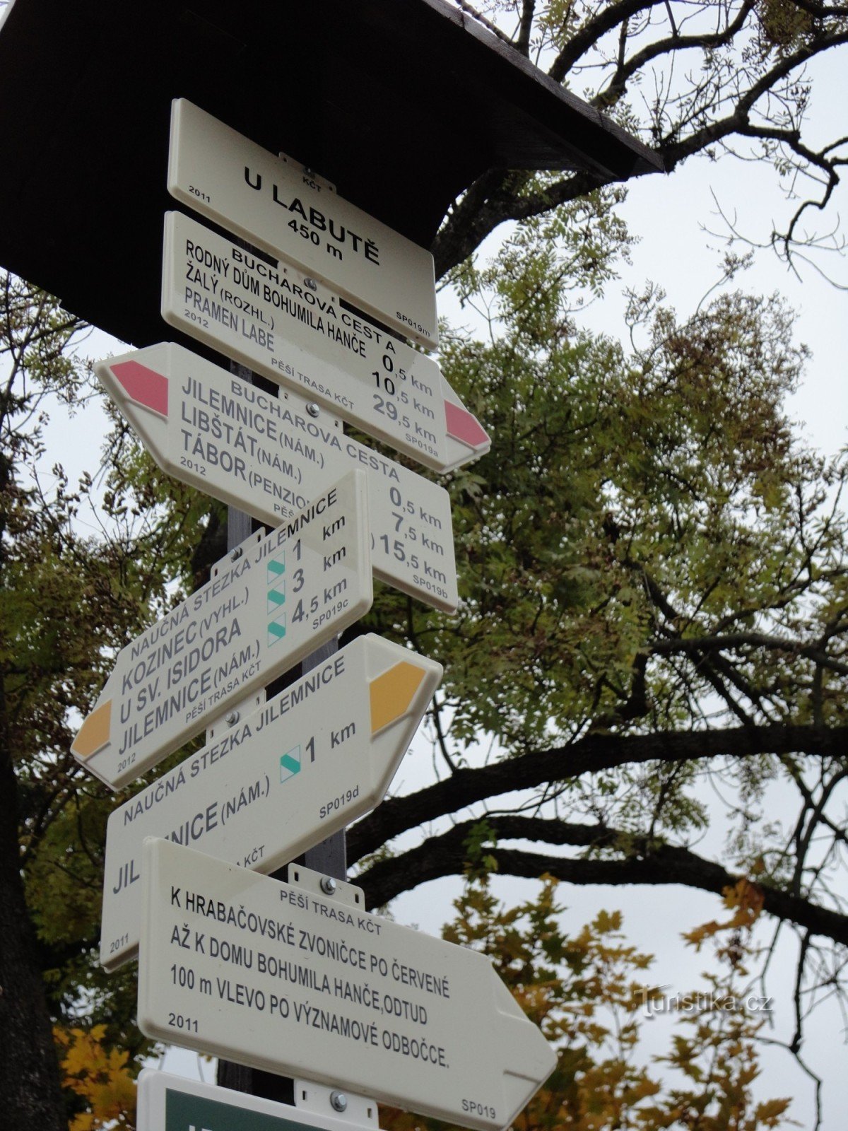 Turistický rozcestník, který se nachází severně od centra Jilemnice v místě zvaném u Labutě, ukazuje turistům cestu do dvou směrů. Po červené značce ve směru Tábor, Lomnice nad Popelkou, Libštát, Jilemnice - Hrabačov, Dolní Štěpanice, Benecko, Žalý, Na Rovince, Horní Mísečky, Vrbatova bouda, Pramen Labe a po žlutě značeném okruhu Jilemnice - Kozinec - Jilemnice, žlutou značku „kopíruje“ NS…