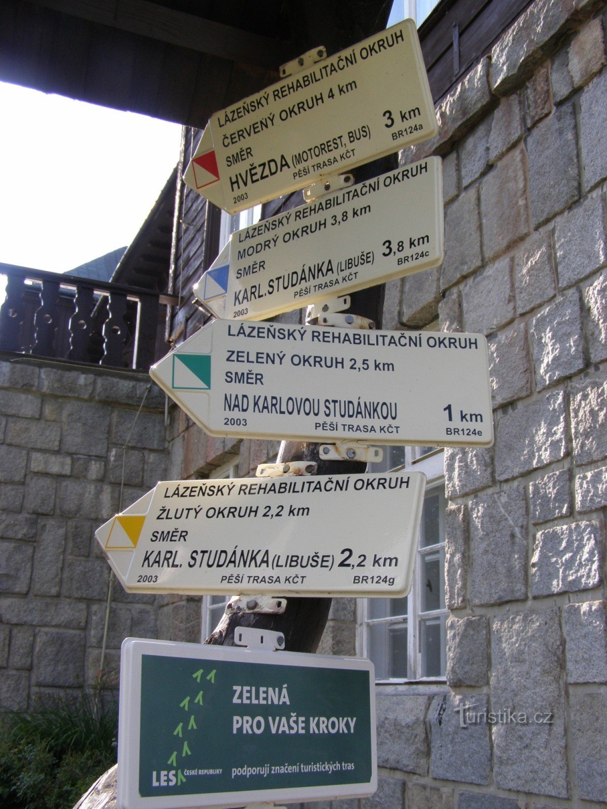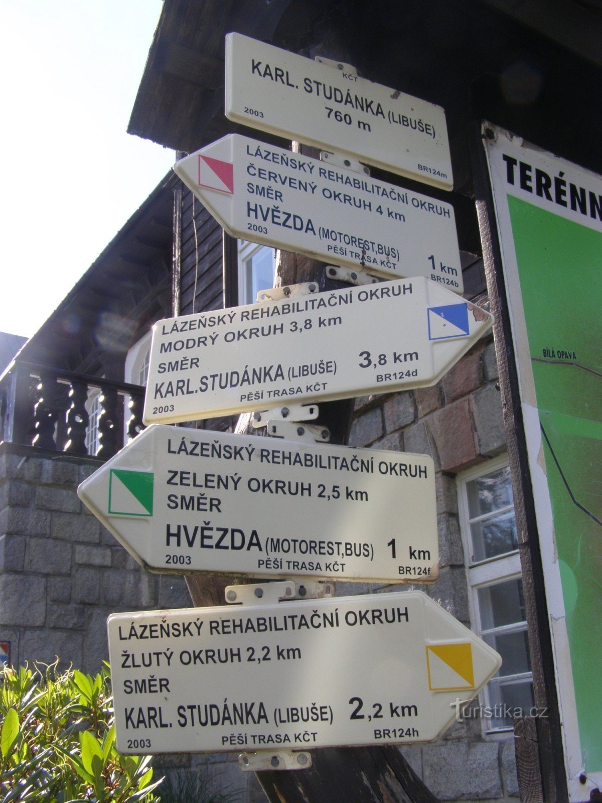 Turistický rozcestník, který se nachází u lázeňského domu Libuše, ukazuje turistům a rekreantům cestu do 4. rehabilitačních okruhů. Tyto okruhy jsou značeny půleným čtvercem s danou barvou (jako naučné stezky). Okruh červený má délku 3 km, okruh modrý 3,8 km, okruh žlutý 2,2 km, nejkratší je okruh zelený o délce 1 km.