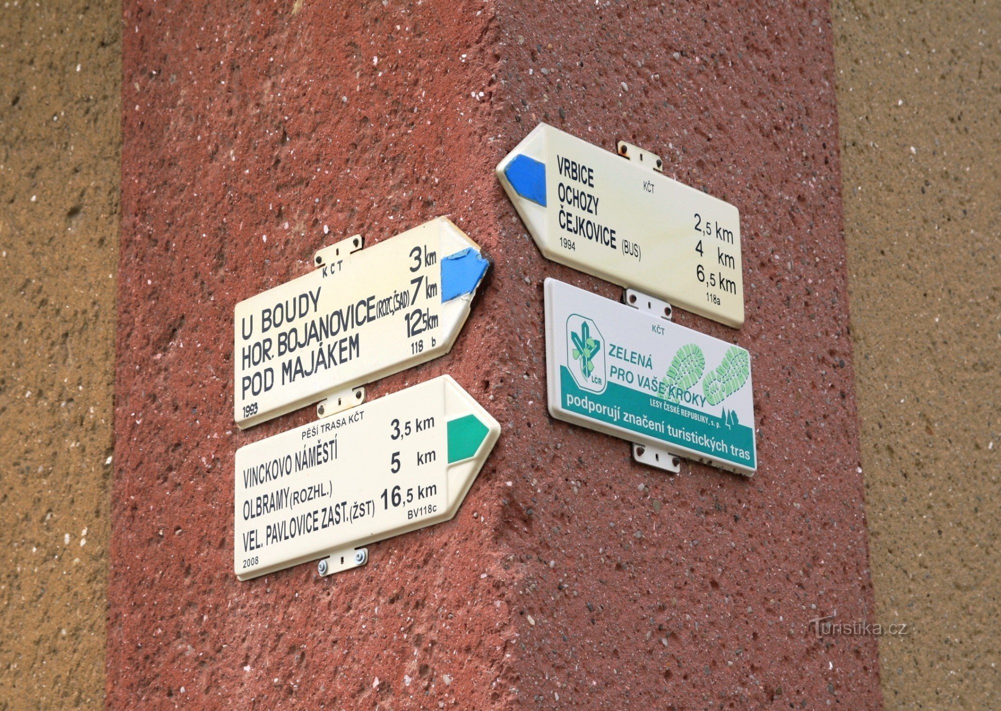 Nachází se na objektu železniční stanice. Prochází tudy modře značená turistická cesta a nově i zelená značka. Modrá vede jedním směrem přes rozcestí U boudy, kolem vrcholu Přední kout a končí v Křepicích. Opačným směrem prochází Kobylím, vystoupá na Vrbici a končí v Čejkovicích. Zelená pak směřuje údolím Trkmanky do sklepního areálu Kraví Hora a přes Kravihorskou rozhlednu a Němčičky dojede až…