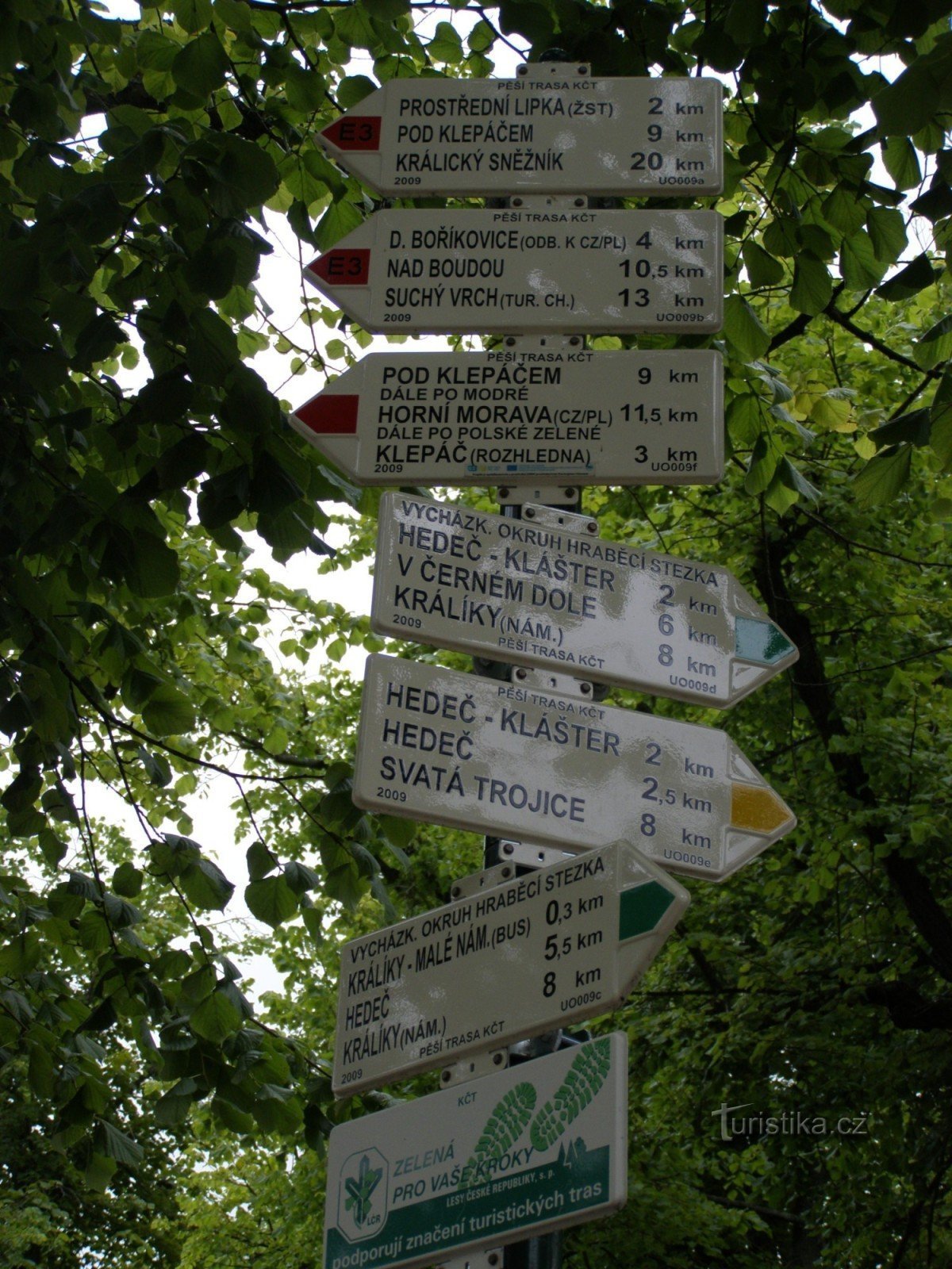 Turistický rozcestník, který se nachází na náměstí v Králíkách, ukazuje turistům cestu do více směrů. Po červené značce ve směru Králický Sněžník, Pod Klepáčem, Prostřední Lipka - Boříkovice, Bouda a dále možno buď na Mladkov, nebo Suchý vrch. Po značce žluté ve směru Králíky - Hedeč klášter, Svatá Trojice, Šumperk. Značka zelená ukazuje cestu po 8 km dlouhém vycházkovém okruhu zvaném Hraběcí…