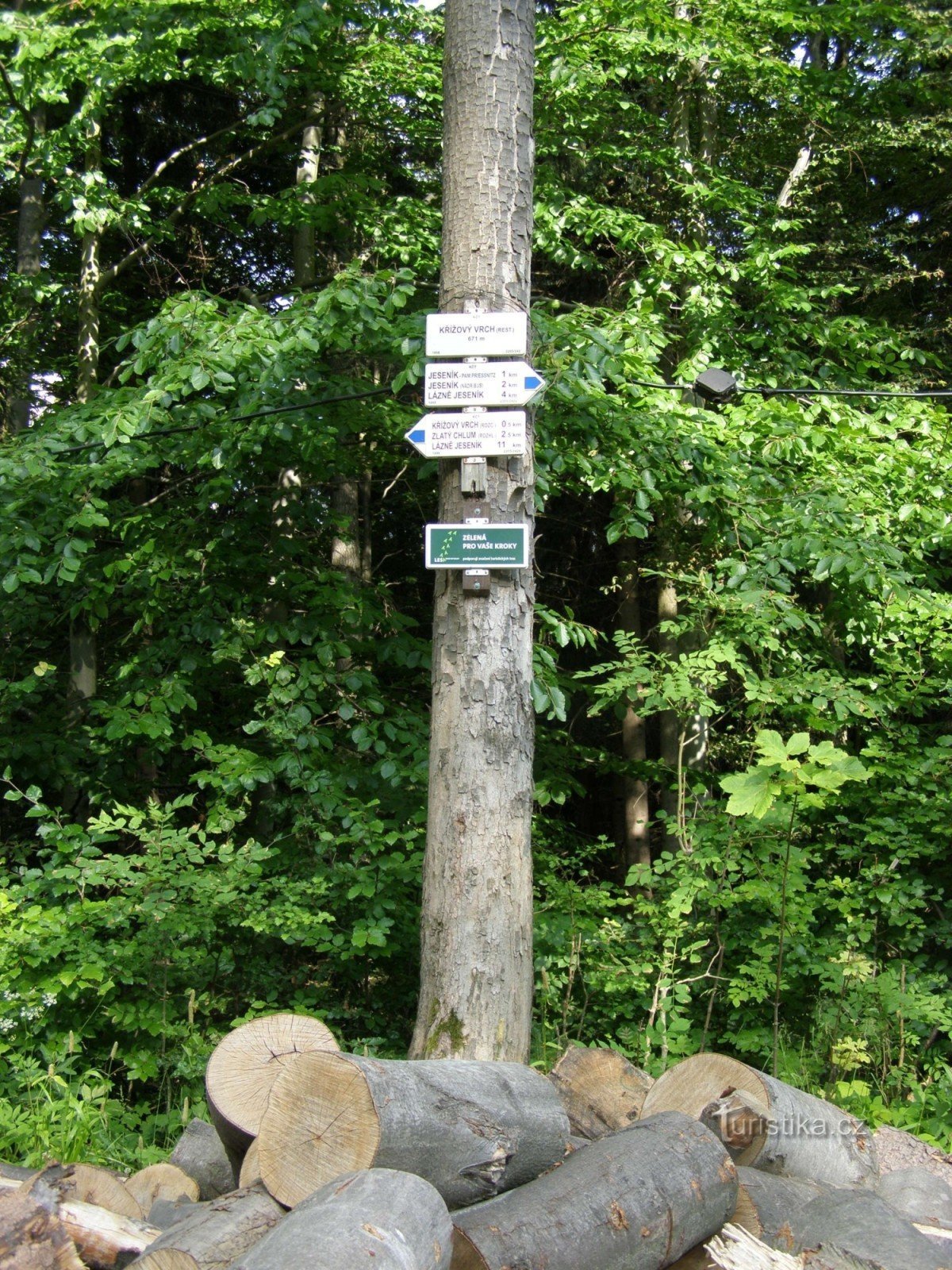 Turistický rozcestník, který se nachází u parkoviště na Křížovém vrchu, ukazuje turistům cestu po modře značeném okruhu ve směru Lázně Jeseník, Jeseník, Křížový vrch - Zlatý Chlum, Čertovy Kameny, Česká Ves, Krajník, Lázně Jeseník. Délka okruhu je cca 15 km.