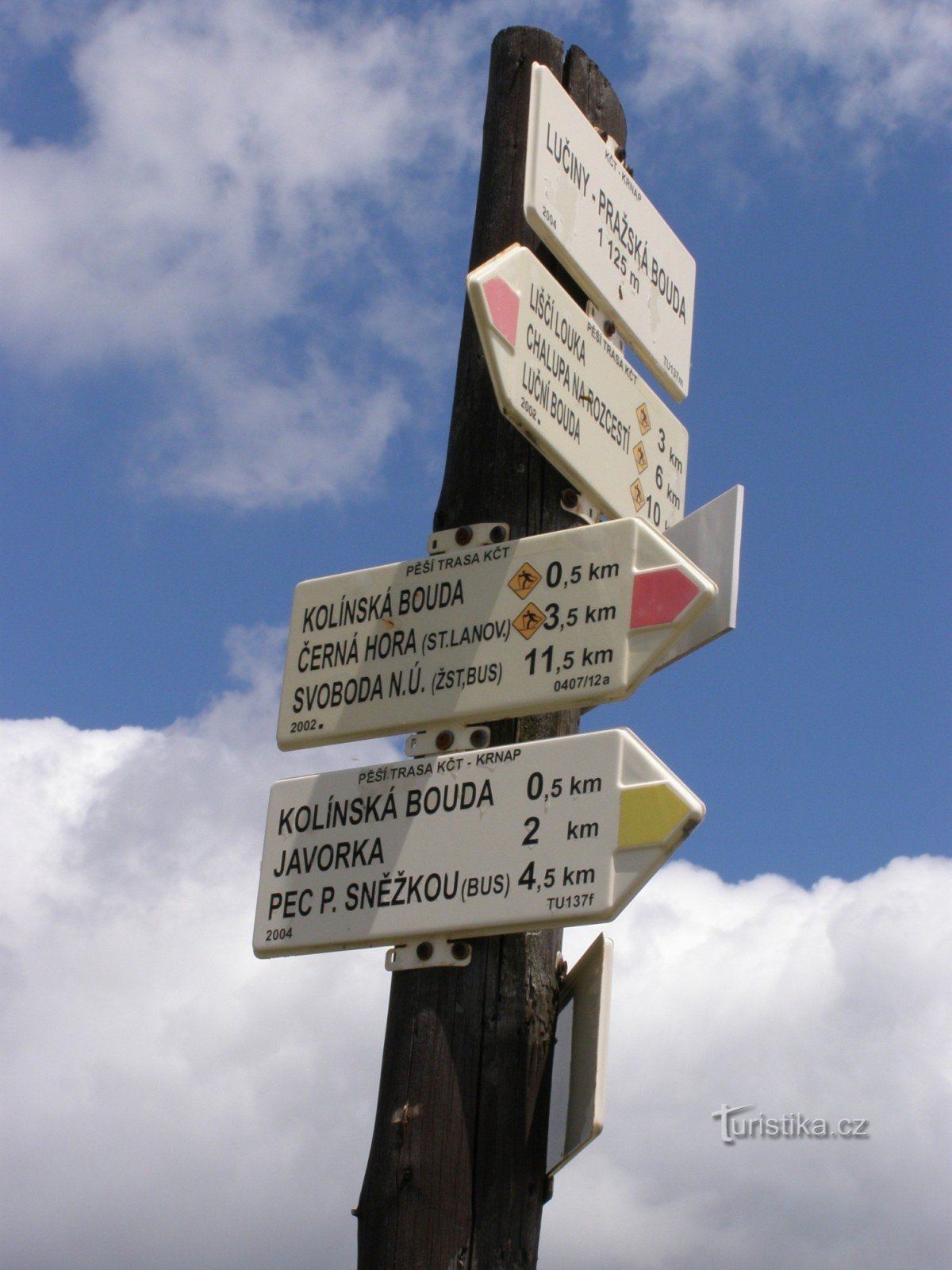 Turistický rozcestník, který se nachází na Lučinách u známé Pražské boudy, ukazuje turistům cestu do tří směrů. Po značce červené ve směru Chalupa na Rozcestí, Liščí louka, Lesní bouda, rozc. Pod Lesní boudou, Hrnčířské Boudy - Kolínská bouda, Černá Hora, Svoboda nad Úpou, po značce zelené ve směru Chalupa Na Rozcestí, Dvorská bouda, Černý potok, Lučiny - Pod Slatinnou strání, Javorské boudy,…