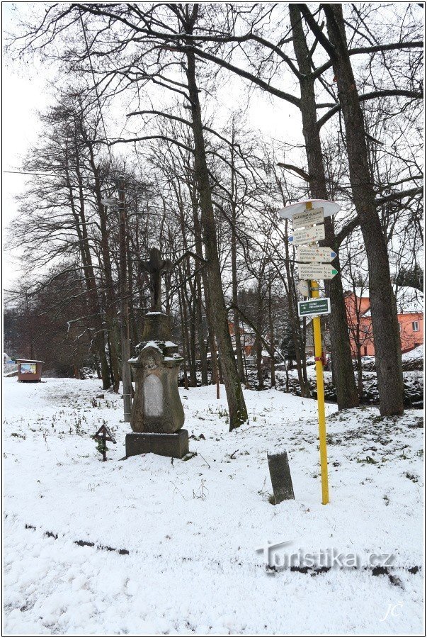 Turistické rozcestí leží na hlavní silnici Králíky - Hanušovice pod hostincem u přejezdu na dolním konci Malé Moravy. Vyznačuje směry těchto značených tras: