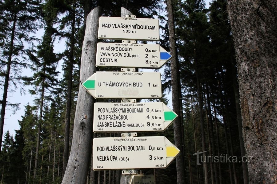 Turistické rozcestí Nad Vlašskými Boudami vás vede do tří směrů, Po modré můžete dojít k Vlašským Boudám, Po zelené potom k Thamovým boudám, nebo opačným směrem Nad pražačku nebo do Jánských lázní. Žlutá značkavásd zavede pod Vlašské Boudy a do Malé Úpy. A na druhou stranu po žluté navštívíte,Černou boudy či Javoří důl.