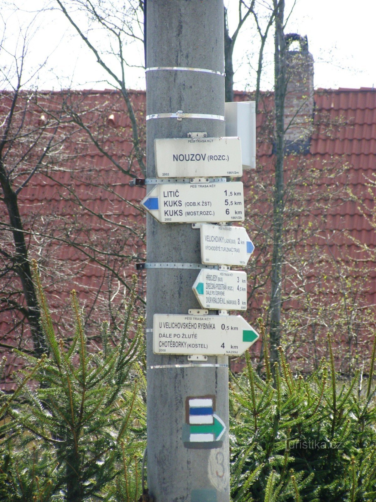 Turistický rozcestník, který se nachází v Nouzově nedaleko kapličky, ukazuje turistům cestu do dvou směrů. Po značce zelené ve směru Nouzov - Žírečská podstráň a po značce modré ve směru Černožice, Velichovky - Kuks.