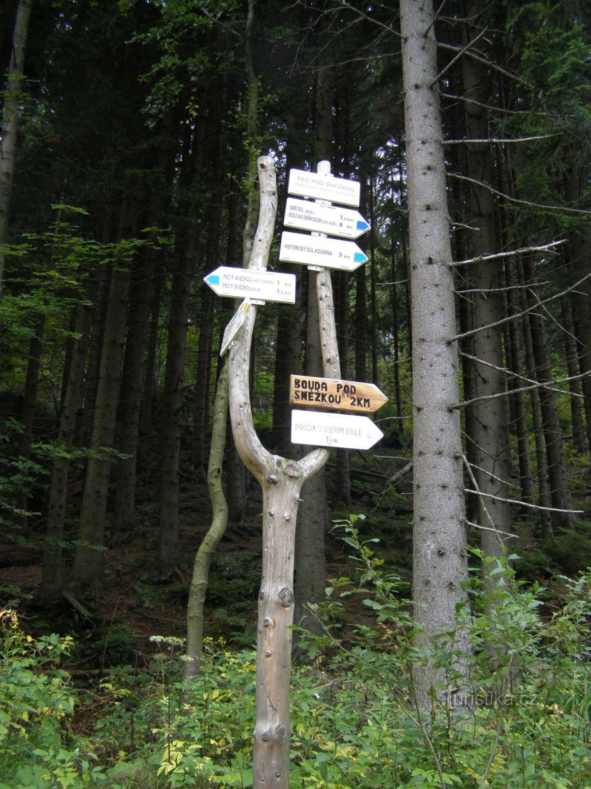 Turistický rozcestník na konci Pece pod Sněžkou ukazuje turistům cestu po modré značce ve směru Pec pod Sněžkou - Sedlo nad Obřím dolem a žlutě značenou odbočku k lanové dráze na Růžohorky, resp. na Sněžku.