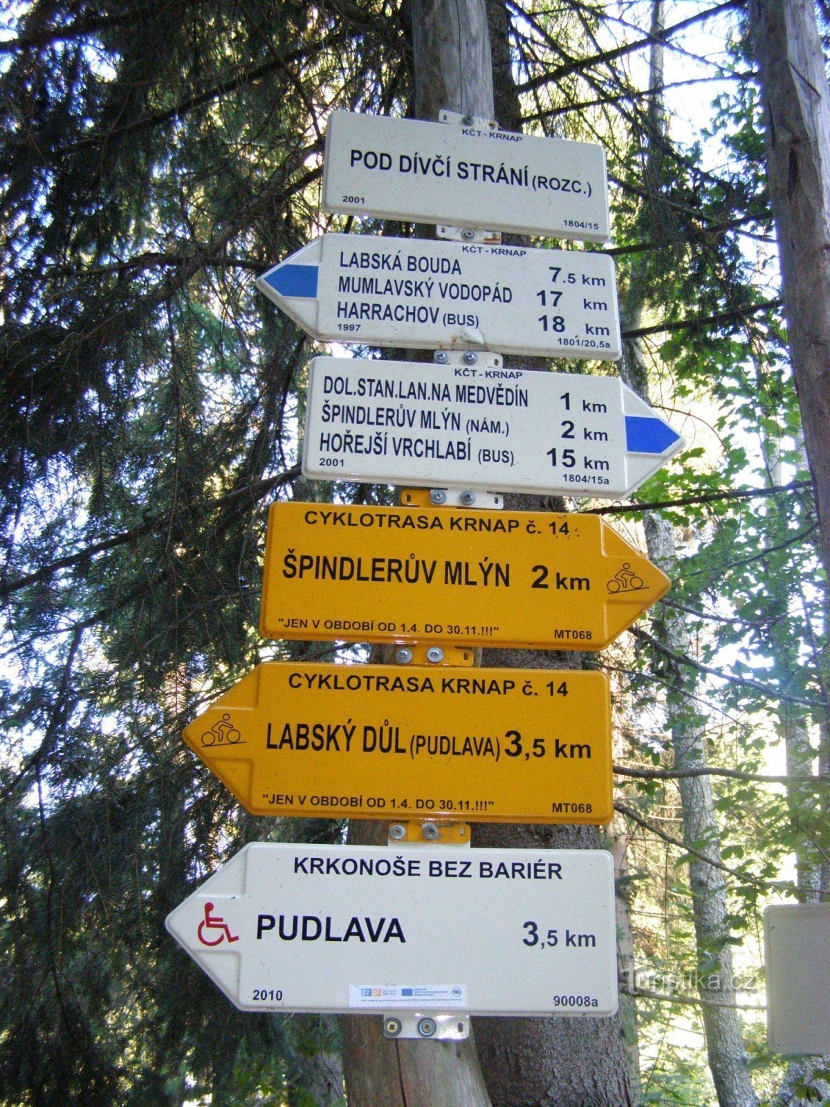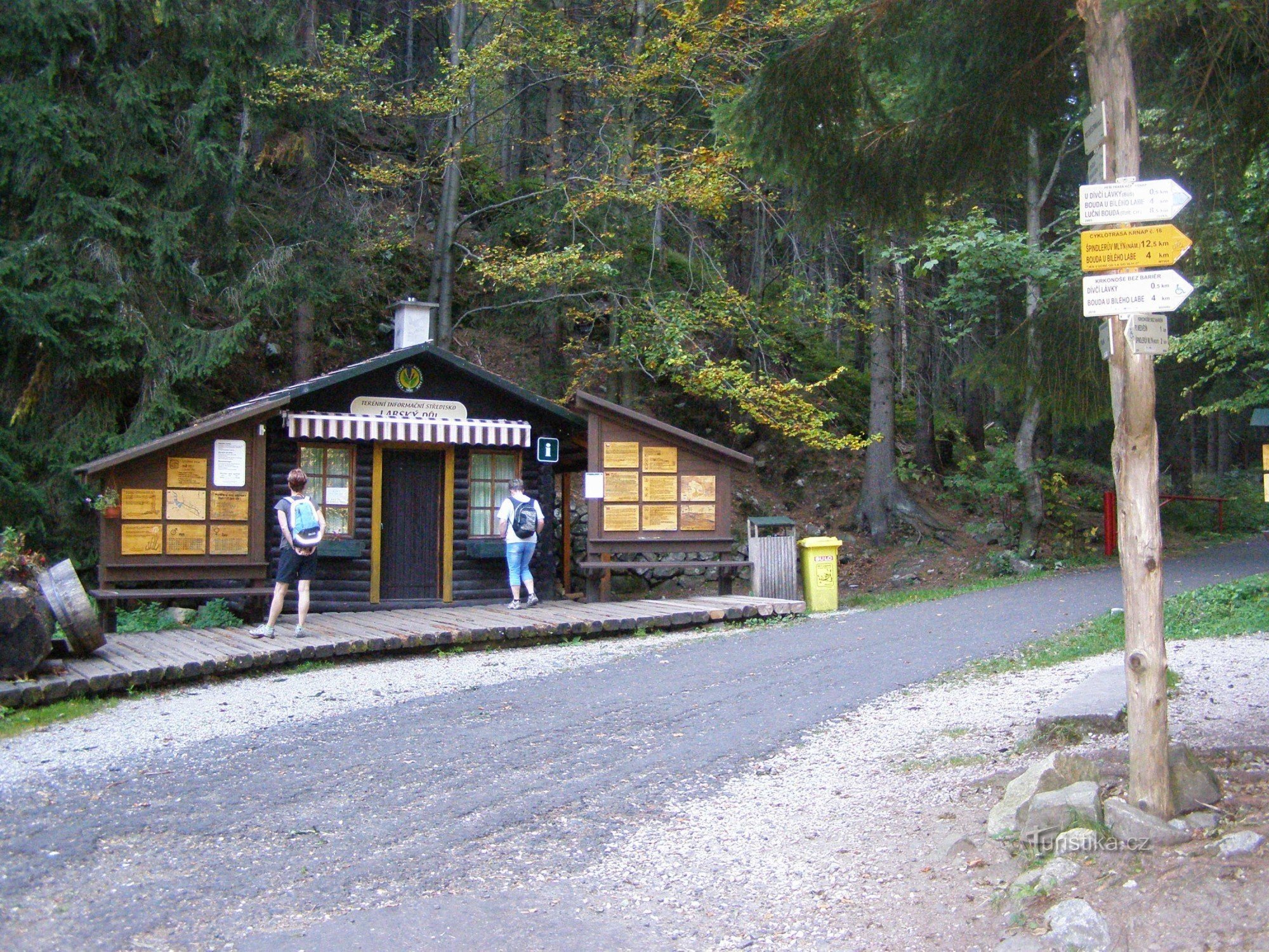 Turistický rozcestník, který se nachází v lokalitě Pod Dívčí strání v blízkosti informačního střediska, ukazuje turistům cestu po modré značce, které se zde větví do tří směrů. Tj. Labským dolem k Labské boudě a do Harrachova, dále směr Špindlerův Mlýn, Hořejší Vrchlabí a třetím směrem je údolím Bílého Labe k Luční boudě. Samostatně je značena cyklotrasa KRNAP č. 16 a cesty pro vozíčkáře -…
