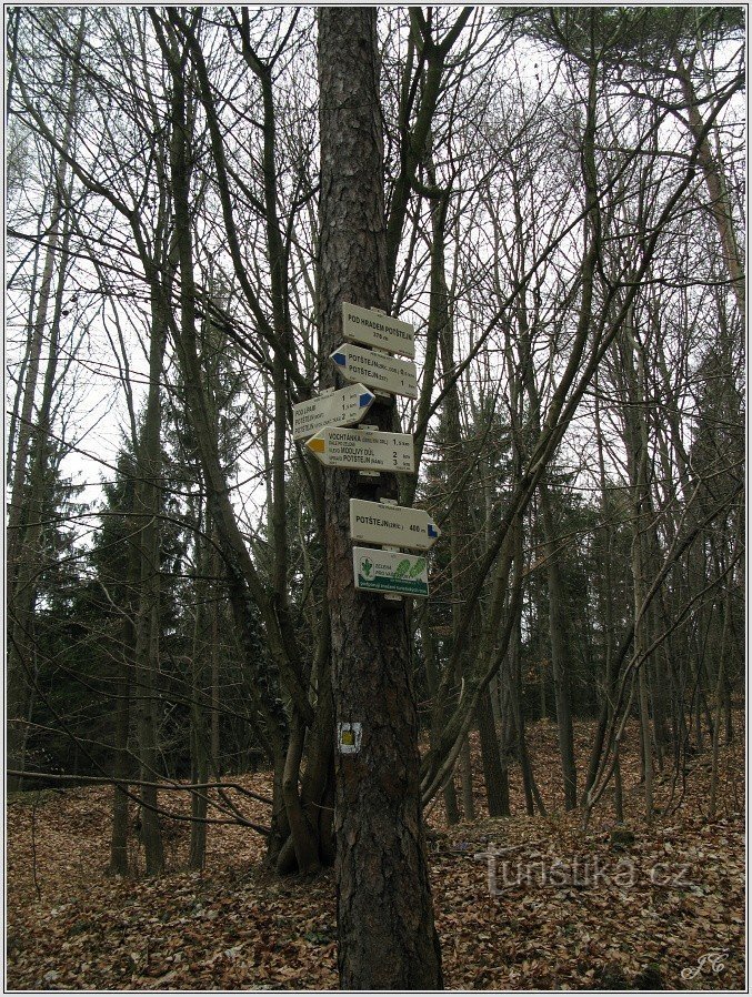 Turistické rozcestí se nachází asi 400 metrů od vchodu do areálu hradu. Vede sem modře značená trasa z potštejnského nádraží, která pokračuje po úbočí kopce k Divoké Orlici k rozcestí Pod lipami a do centra Potštejna. Rovněž je zde vyznačena odbočka k hradu. A konečně tu začíná krátká žlutá spojka k Divoké Orlici na rozcestí se zelenou značkou (Vochtánka) do Potštejna nebo Modlivým dolem na Polom…