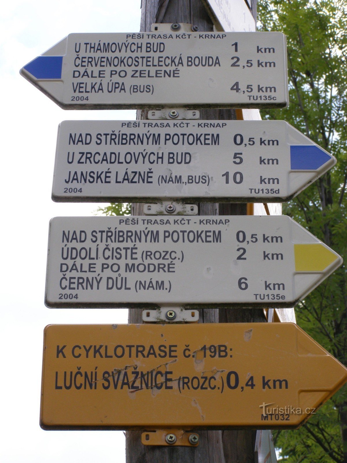 Turistický rozcestník, který se nachází v sedle pod Kolínskou boudou, ukazuje turistům cestu do tří směrů. Po značce červené ve směru Chalupa na Rozcestí, Liščí louka, Lesní bouda, rozc. Pod Lesní boudou, Hrnčířské Boudy, Pražská bouda, Kolínská bouda - hotel Černá Bouda, Černá Hora, Svoboda nad Úpou a po značce modré ve směru Javoří Důl, Thámovy boudy - Nad Stříbrným potokem, Zrcadlovky, Nad…