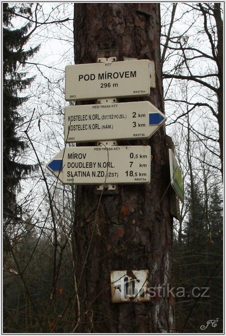 Turistický rozcestník leží na odbočce ze silnice k bývalému rekreačnímu středisku Mírov jižně od Kostelce nad Orlicí. Prochází tudy tato turistická trasa: