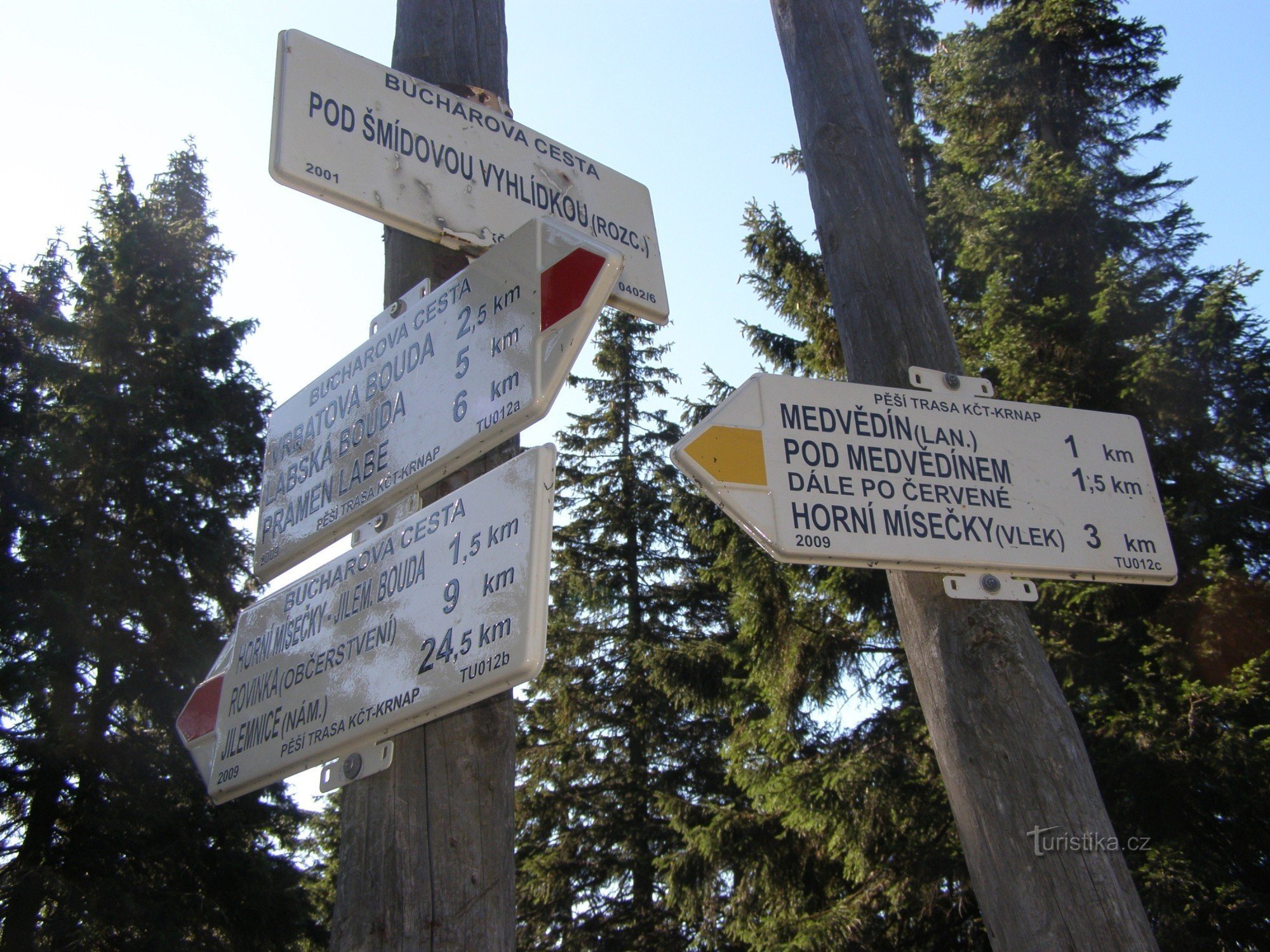 Turistický rozcestník, který se nachází pod Šmídovou vyhlídkou, ukazuje turistům cestu do dvou směrů. Po značce červené ve směru pramen Labe, Labská bouda, Vrbatova bouda - Horní Mísečky, Rovinka, Přední Žalý, Hrabačov, Jilemnice a po spojovací žluté značce od Horních Míseček přes Mědvědín k rozcestí pod Šmídovou vyhlídkou.