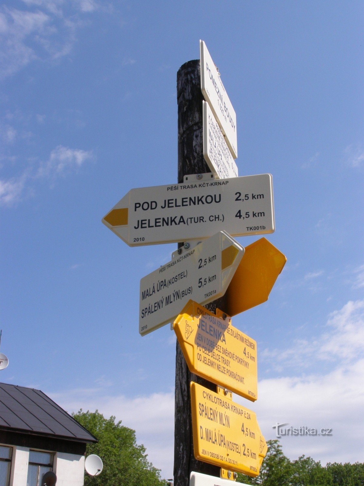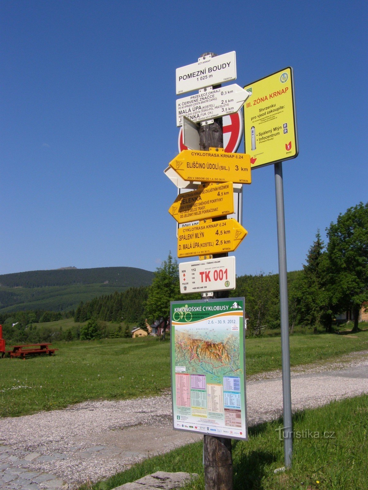 Turistický rozcestník, který se nachází na Pomezních Boudách, ukazuje turistům cestu do několika směrů. Tj. směr k hlavnímu rozcestníku u státní hranice (cca 350 metrů) a trasu po žluté značce ve směru Jelenka, Pod Jelenkou - Malá Úpa, Spálený mlýn. Cyklistům ukazují cestu žluté směrníky po trase Krnapu. č. 24 ve směru Eliščino Údolí - Malá Úpa kostel, Spálený Mlýn. Samostatný směrník ukazuje…
