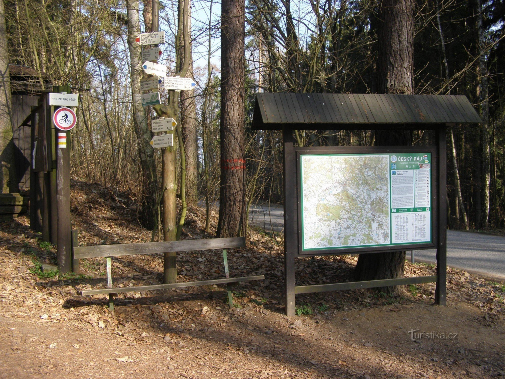 Turistický rozcestník, který se nachází při vstupu do skalního města, ukazuje turistům cestu do více směrů. Po značce červené ve směru Jičín - Prachovské skály, po značce žluté také ve směru Jičín - Prachovské skály a po značce modré ve směru Jinolické rybníky - Brada, Jičín. Zeleně je značena spojovací cesta mezi rozcestím a hotelem Pod Šikmou věží.