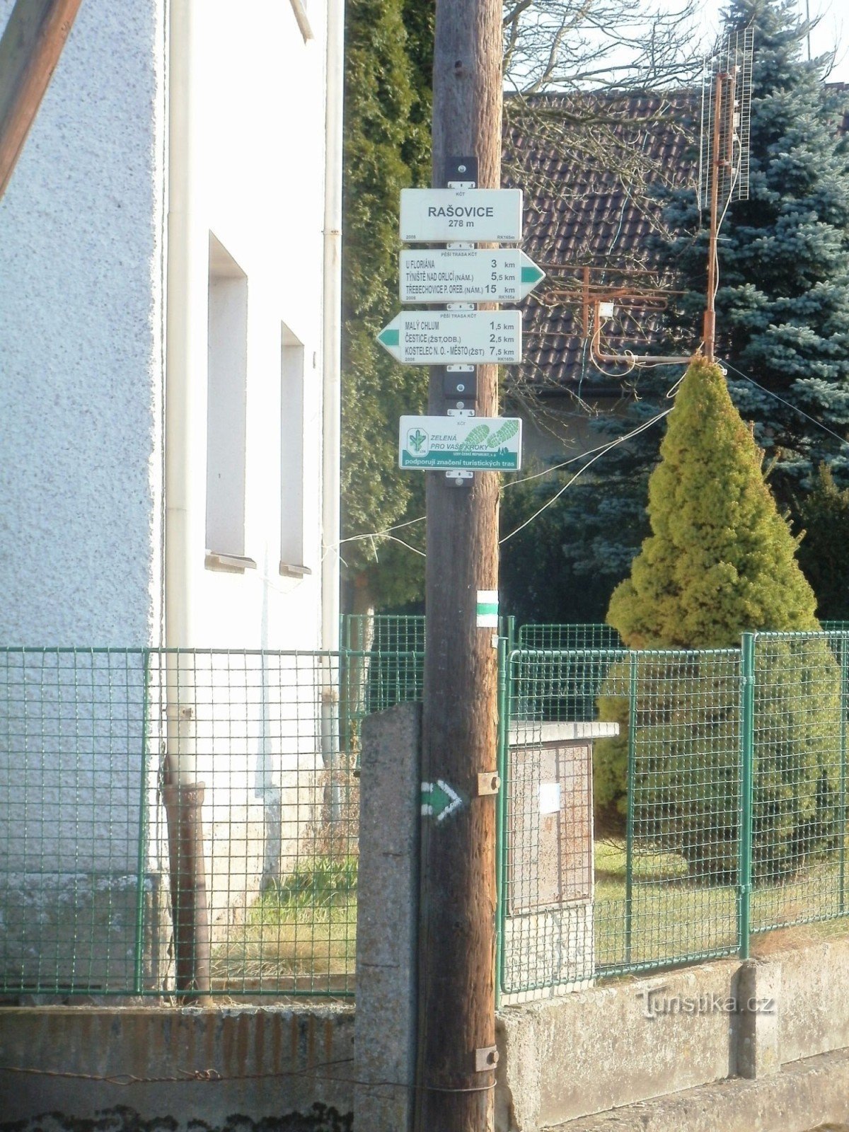 Turistický rozcestník, který se nachází v jižní části obce Rašovice, ukazuje turistům cestu po zelené značce ve směru Třebechovice pod Orebem, Týniště nad Orlicí, U Floriána - Malý Chlum, Čestice, Častolovice, Kostelec nad Orlicí.