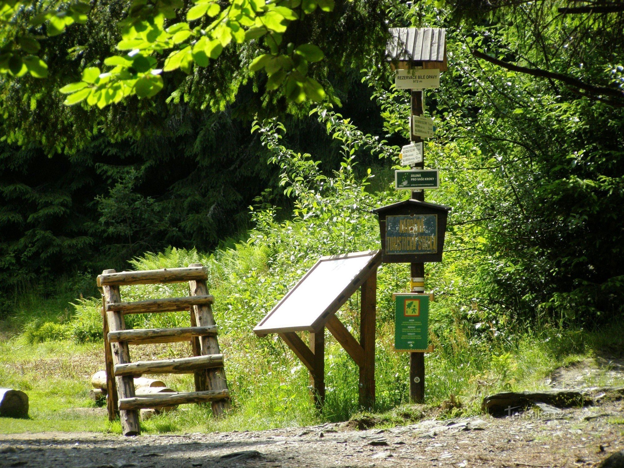 Turistický rozcestník, který se nachází ve spodní části údolí Bílé Opavy, ukazuje turistům cestu do dvou směrů. Po modré značce ve směru Vrbno pod Pradědem, Malá Hvězda, Karlova Studánka - Nad Vodopády Bílé Opavy, Ovčárna, Velký Kotel, Karlov, Malá Morávka a po značce žluté ve směru Malá Morávka, Karlov, Ovčárna, Pod Ovčárnou, Nad vodopády Bílé Opavy - Karlova Studánka, Malá Hvězda, Anenská…