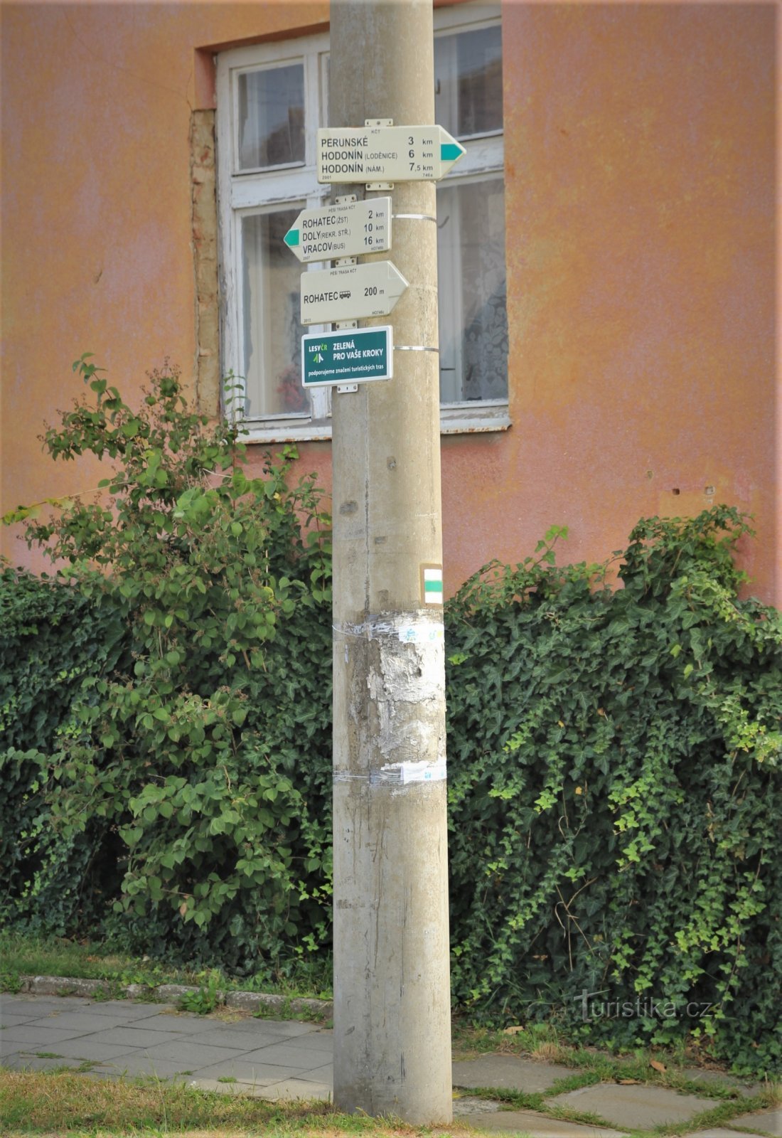Turistické rozcestí se nachází v obci na ulici Nové řádky v místech, kde začíná ulice Slovácká. Prochází tudy zeleně značená turistická trasa, která vede jedním směrem k železniční stanici v Rohatci, dále pokračuje na letovisko Soboňky a borovicovými lesy přes rekreační středisko Doly-Littner dojde do Vracova. Opačným směrem pak směřuje kolem mrtvých ramen a tůní řeky Moravy na rozcestí Perunské…