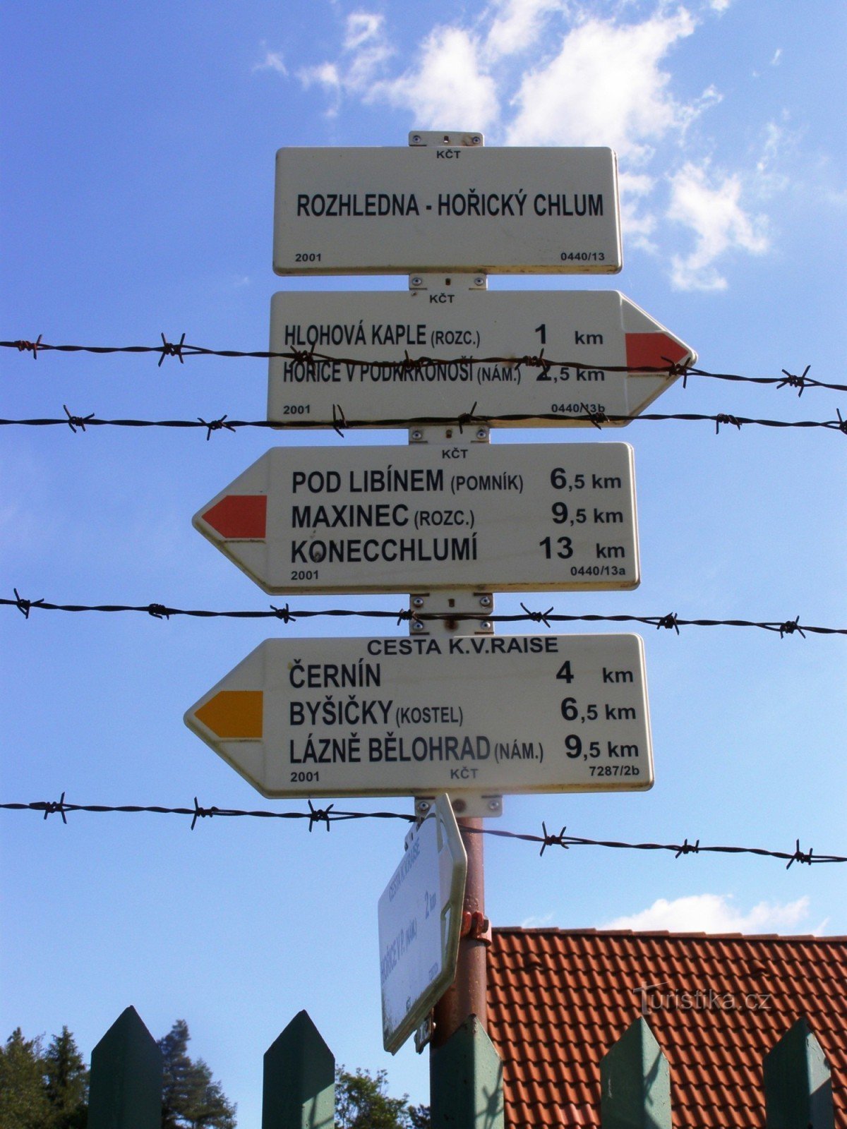 Turistický rozcestník, který se nachází u Rozhledny na Hořickém Chlumu ukazuje turistům cestu do dvou směrů. Po červené značce ve směru Hořice - Libín, Maxinec, Konecchlumí a po žlutě značené cestě K.V.Raise ve směru Hořice - Byšičky, Lázně Bělohrad.