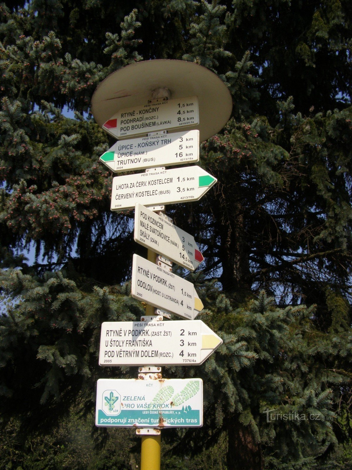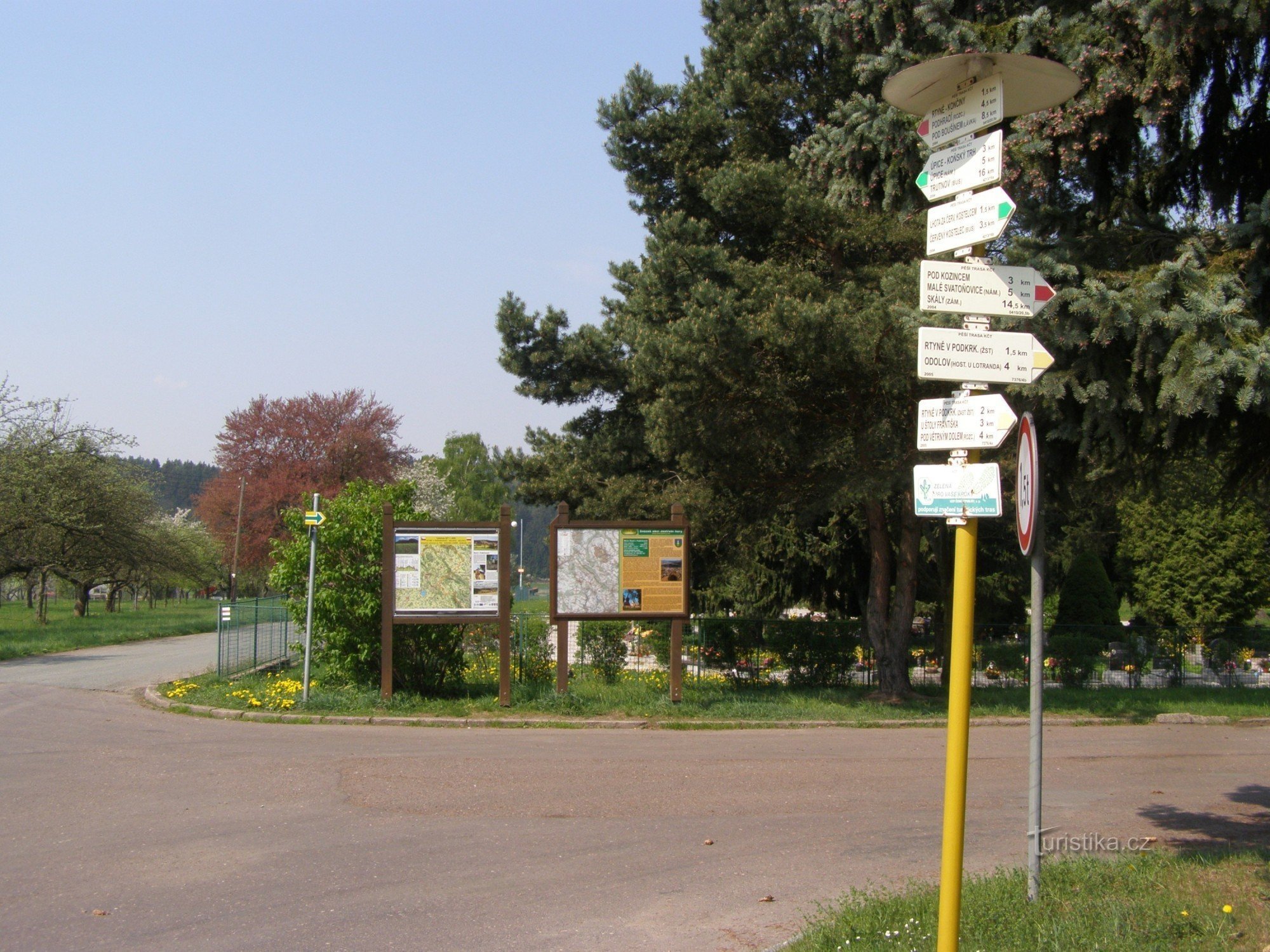 Turistický rozcestník, který se nachází nad Rychtou a zároveň nad kostelem s dřevěnou zvonicí, ukazuje turistům cestu do tří směrů. Po červené značce ve směru Podhradí - Malé Svatoňovice, po značce zelené ve směru Trutnov, Úpice - Červený Kostelec (Horní Kostelec) a po značce žluté ve směru Odolov - Pod Větrným dolem.