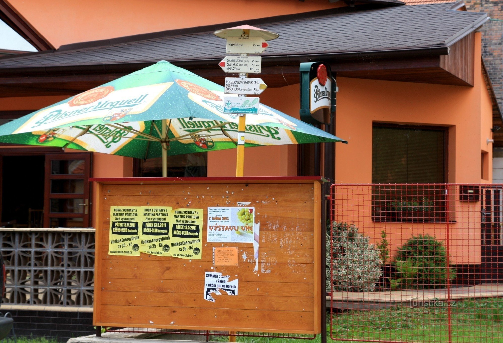 Nachází se na zdejší návsi u restaurace Isis. Prochází tudy červeně značená turistická cesta, která směřuje jedním směrem k vlakové zastávce do Popic a druhým na po hrázi Věstonické nádrže do Dolních Věstonic a dále pak na hlavní hřeben Pálavy a končí v Mikulově. Začíná zde žlutá spojka, která vede Sklepní ulicí podél břehu Věstonické nádrže až k modře značené cestě vedoucí z Pouzdřan do kempu…