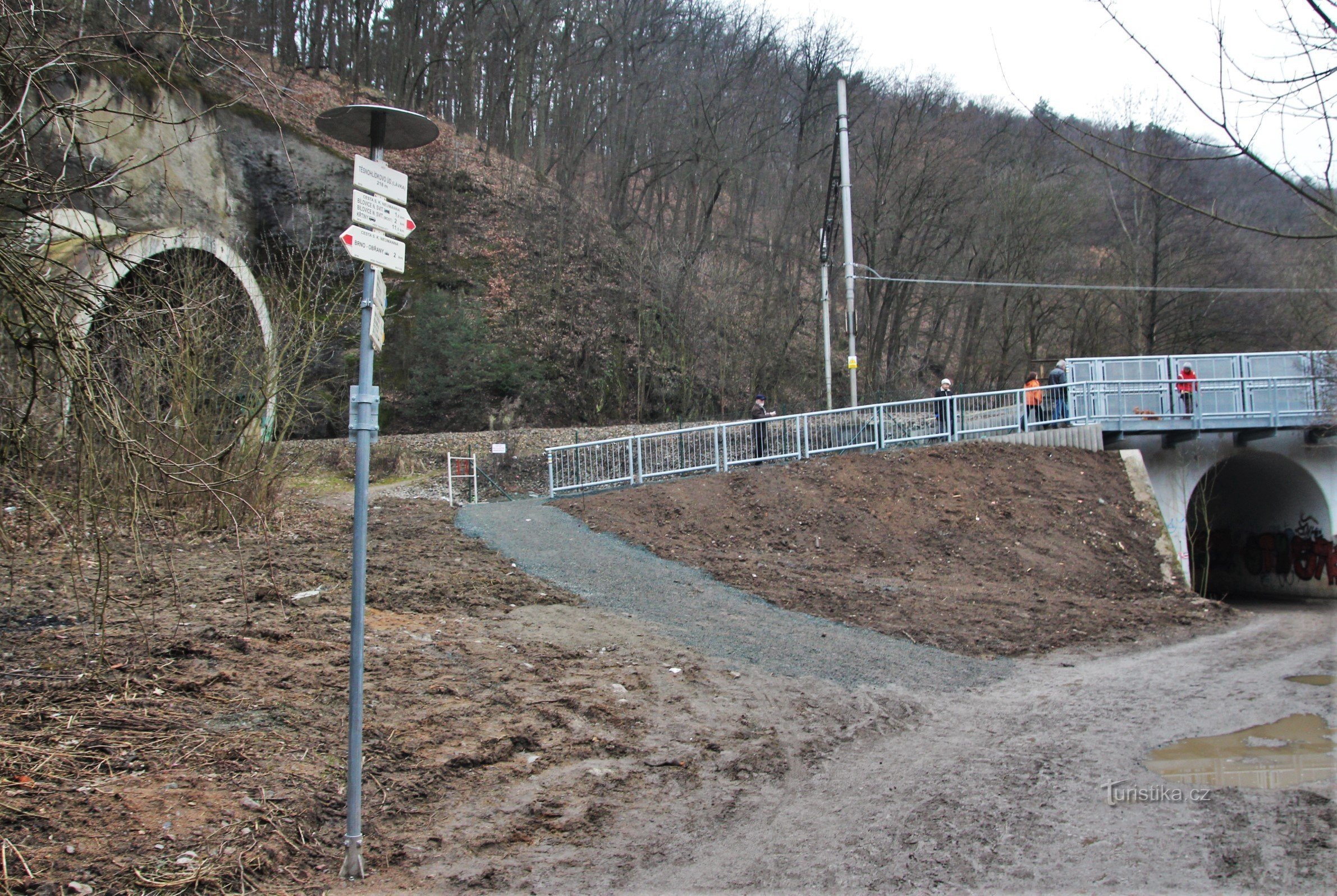 Nachází se na pravém břehu řeky Svitavy u nově otevřené lávky, jejíž provoz byl zahájen 14. 2. 2016, zavěšené ve stěně železničního mostu překonávající v dostatečné výši tok řeky. Přes ní sem přechází po lávce žlutě a modře značená turistická cesta, které zde končí. Po zdejší příbřežní cestě vede červená značka, která jedním směrem pokračuje po vodě do Obřan k MHD, proti vodě pak do Bílovic nad…