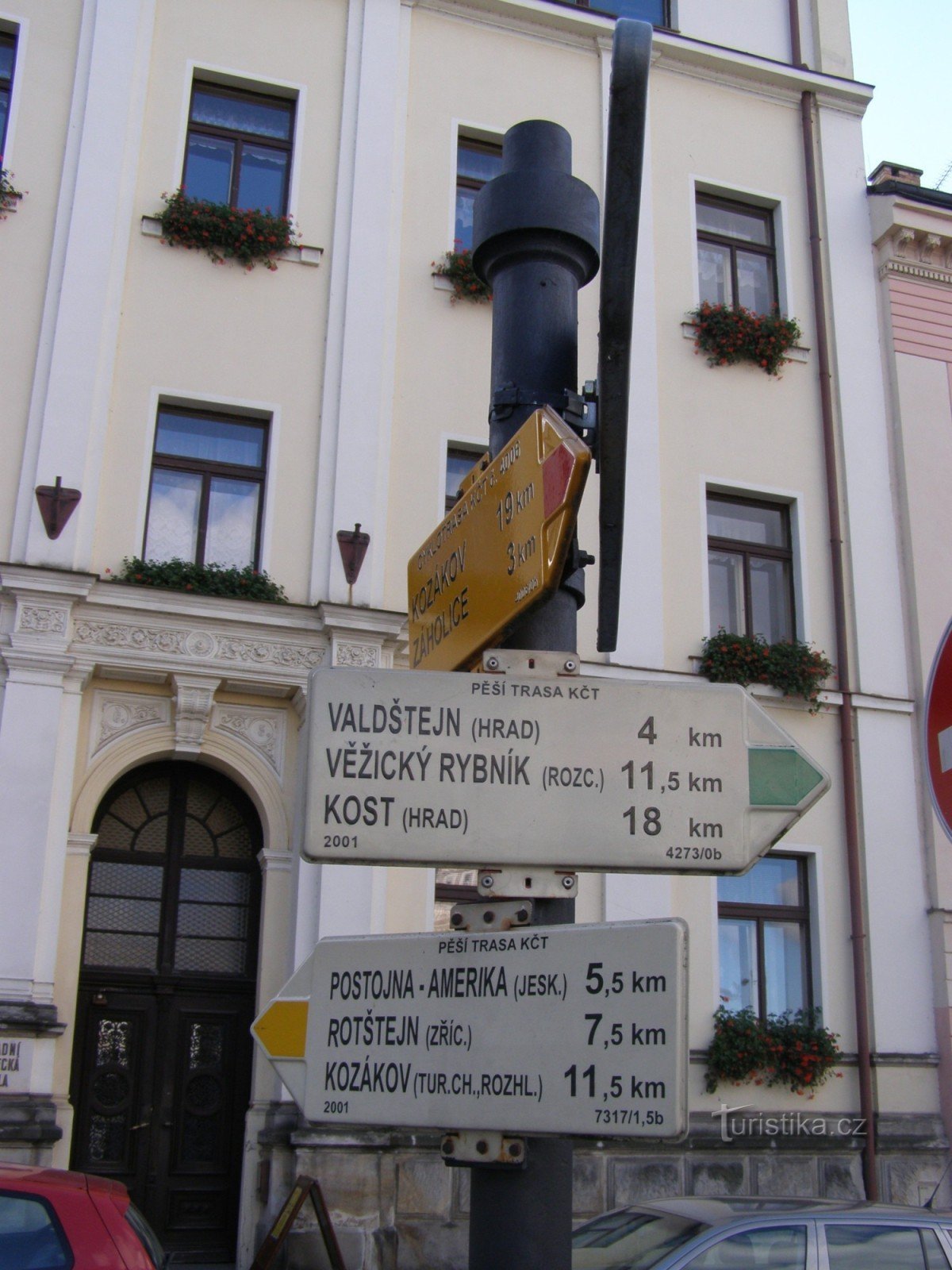 Turistický rozcestník, který se nachází na náměstí Českého ráje v Turnově, ukazuje turistům cestu do čtyř směrů. Po žluté značce ve směru Turnov žst, Turnov bus nádraží - Klokočské průchody, Rotštejn, Kozákov, po značce modré ve směru Turnov - Dolánky, Bartošova pec, Frýdštejn, Kopanina, po značce zelené ve směru Prokopské údolí, Věžický rybník, Valdštejn - Zrcadlová koza, Zbirohy, Chata U…