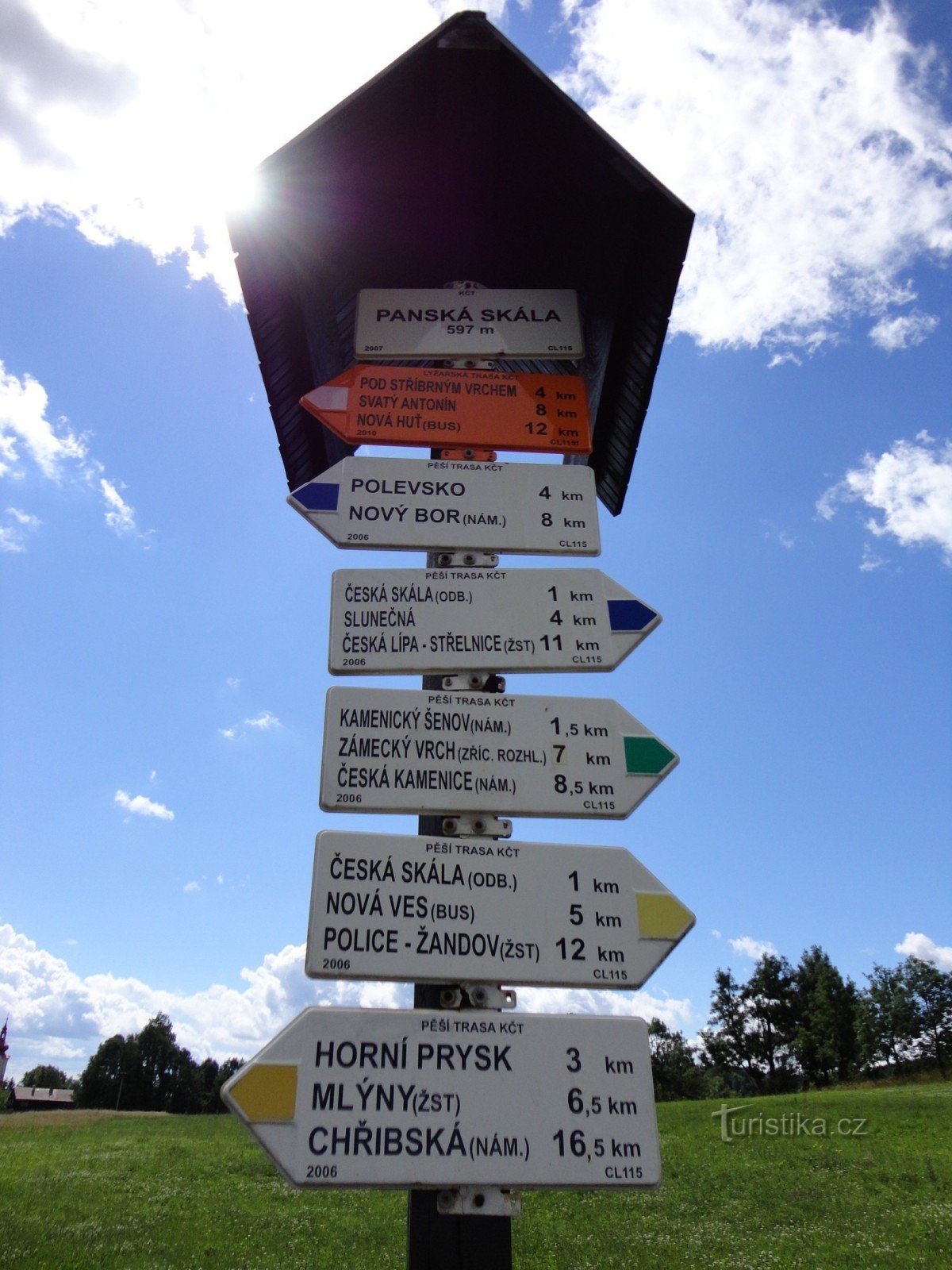 Turistické rozcestí u známého skalního útvaru Panská skála nalezneme v blízkosti infocentra u parkoviště pod panskou skálou. Rozcestník zde ukazuje cestu do tří směrů, po značce modré ve směru Nový Bor, Polevsko - Česká Skála, Slunečná, Česká Lípa, po značce žluté ve směru Žandov, Nová Ves, Česká Skála - Horní Prysk, Mlýny, Chřibská a po značce zelené ve směru Panská skála - Kamenický Šenov,…