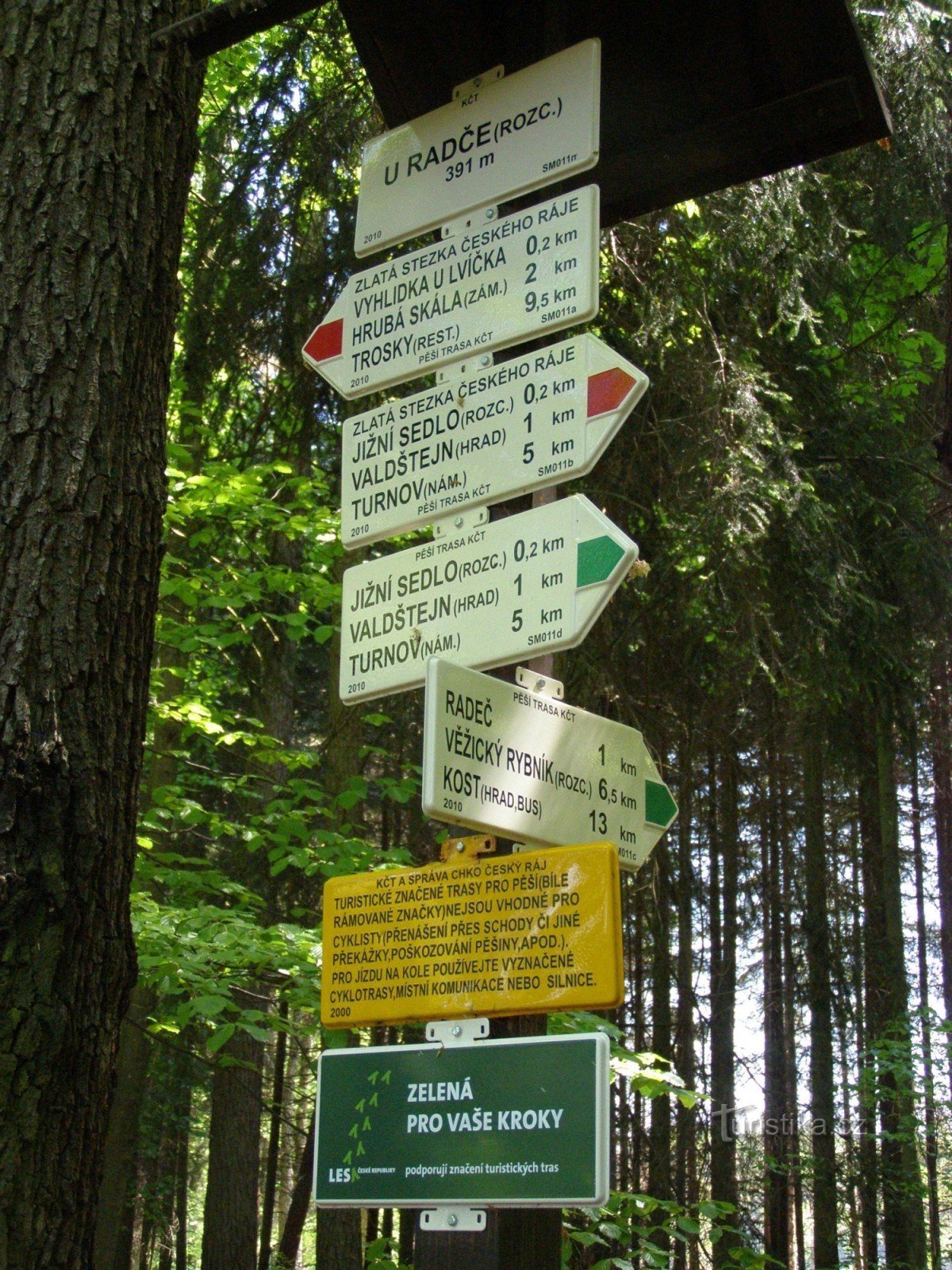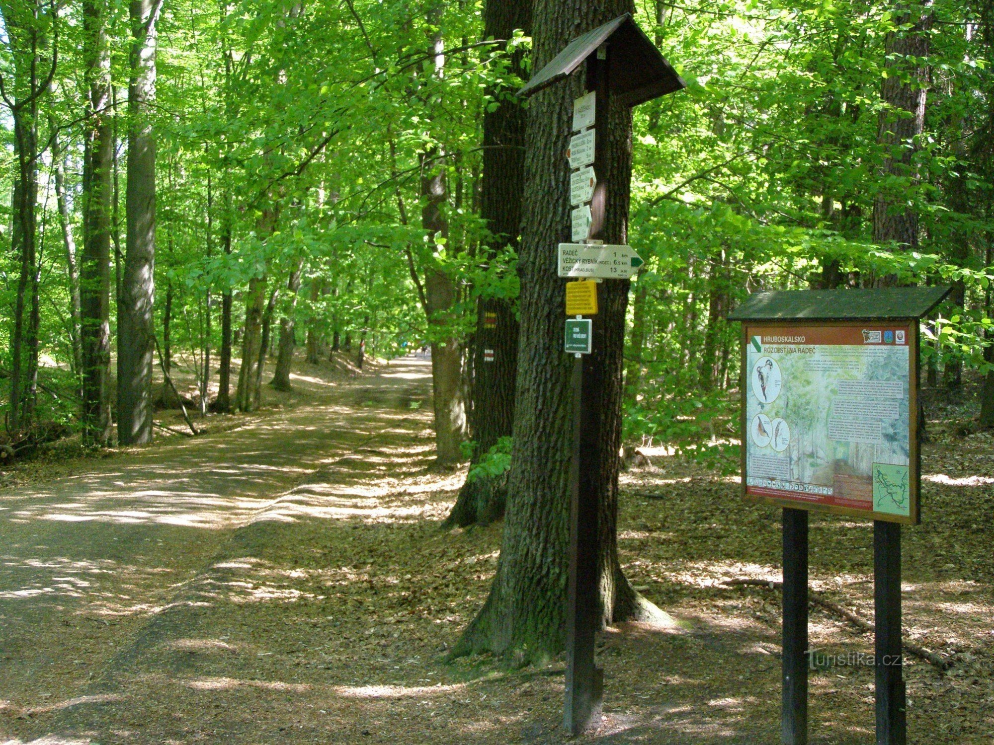 Turistický rozcestník, který se nachází u odbočky k bývalé vsi Radeč, ukazuje turistům cestu do více směrů. Po červeně značené Zlaté stezce Českého ráje ve směru Turnov, Valdštejn - Hrubá Skála, Trosky, Prachovské skály, dále po značce modré ve směru Kozákov, Lestkov, Sedmihorky - Kopicův statek, Podvyskeřský mlýn a po značce zelené ve směru Sobotka, Kost, Věžický rybník, Čertoryje - Radeč,…