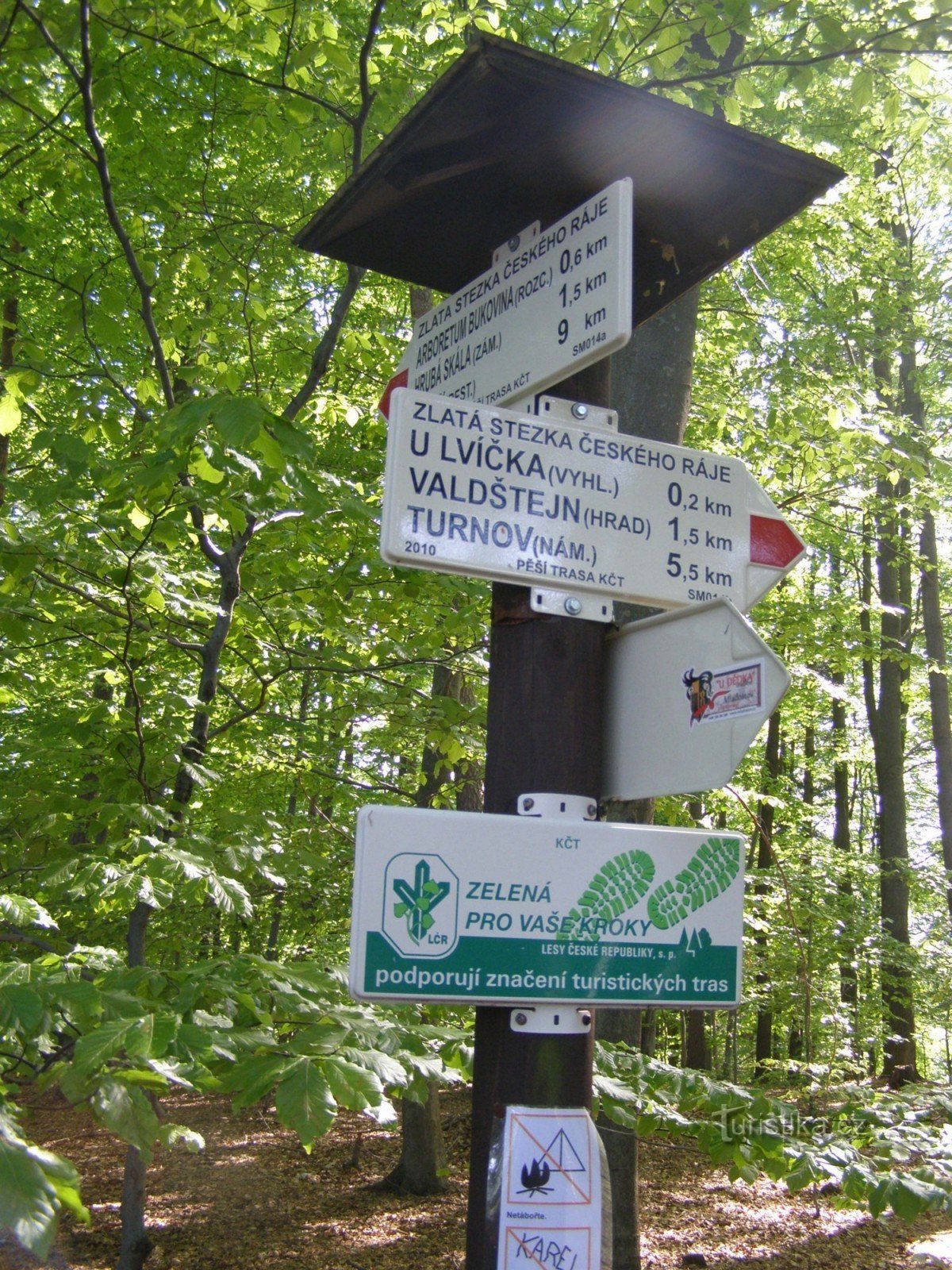 Turistický rozcestník, který se nachází nedaleko Vyhlídky na Kapelu, ukazuje turistům cestu po červené značce ve směru Valdštejn - Hrubá skála a odbočku k Vyhlídce na Kapelu.