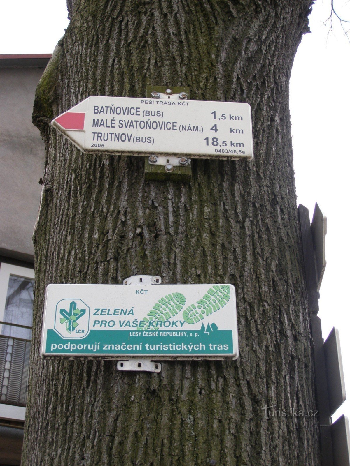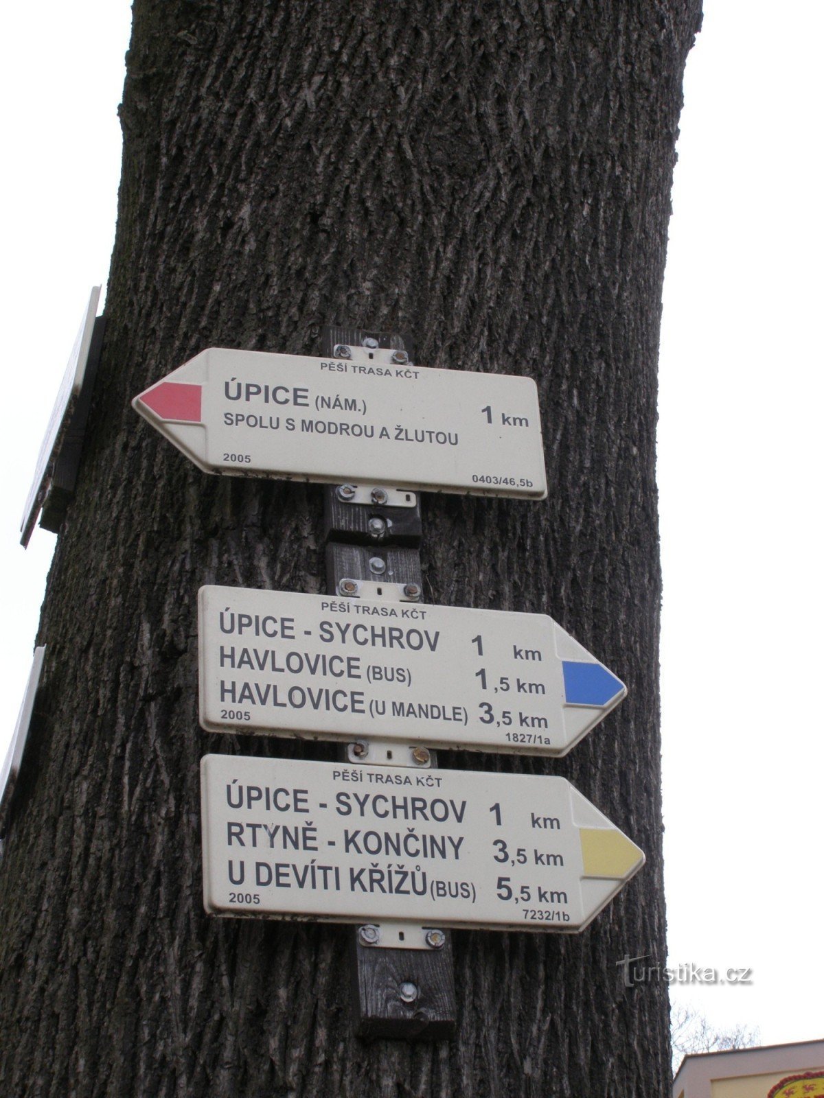 Turistický rozcestník, který se nachází v Úpici u mostu přes řeku Úpu, ukazuje turistům cestu do tří směrů. Po značce červené ve směru Úpice náměstí T.G.M. - Malé Svatoňovice, po značce žluté ve směru Větrník, Hořičky, Křižanov - Úpice, Čížkovy kameny a po značce modré ve směru Úpice náměstí T.G.M. - Havlovice.