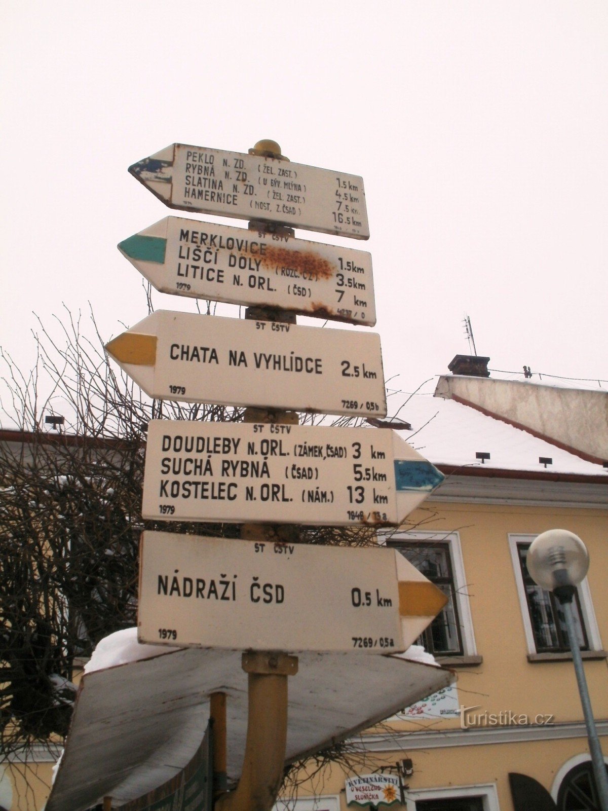 Turistický rozcestník, který se nachází na Husově náměstí ve Vamberku, ukazuje turistům cestu do tří směrů. Po žluté ve směru Vamberk, žst - chata Na Vyhlídce, po modré ve směru Kostelec nad Orlicí, Doudleby nad Orlicí - Julinčino údolí, Říčky a po zelené ve směru Vamberk - Litice nad Orlicí.