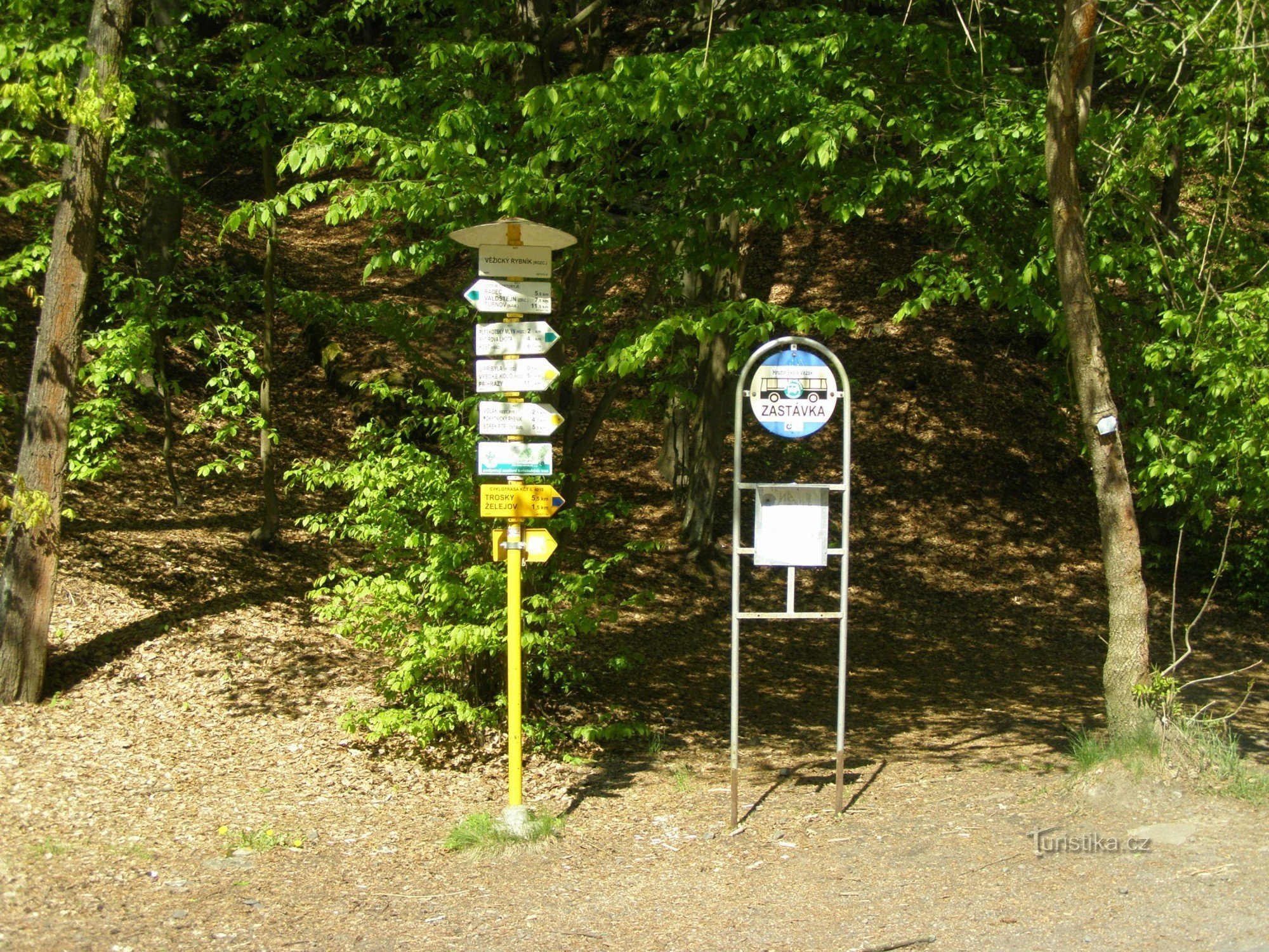 Turistický rozcestník, který se nachází u Věžického rybníku, ukazuje turistům cestu do dvou směrů. Po značce zelené ve směru Sobotka, Kost - Věžický rybník - Radeč, Valdštejn, Turnov a po značce žluté ve směru Příhrazy, Vysoké Kolo - Vidlák, Rokytnický rybník, Borek pod Troskami.
